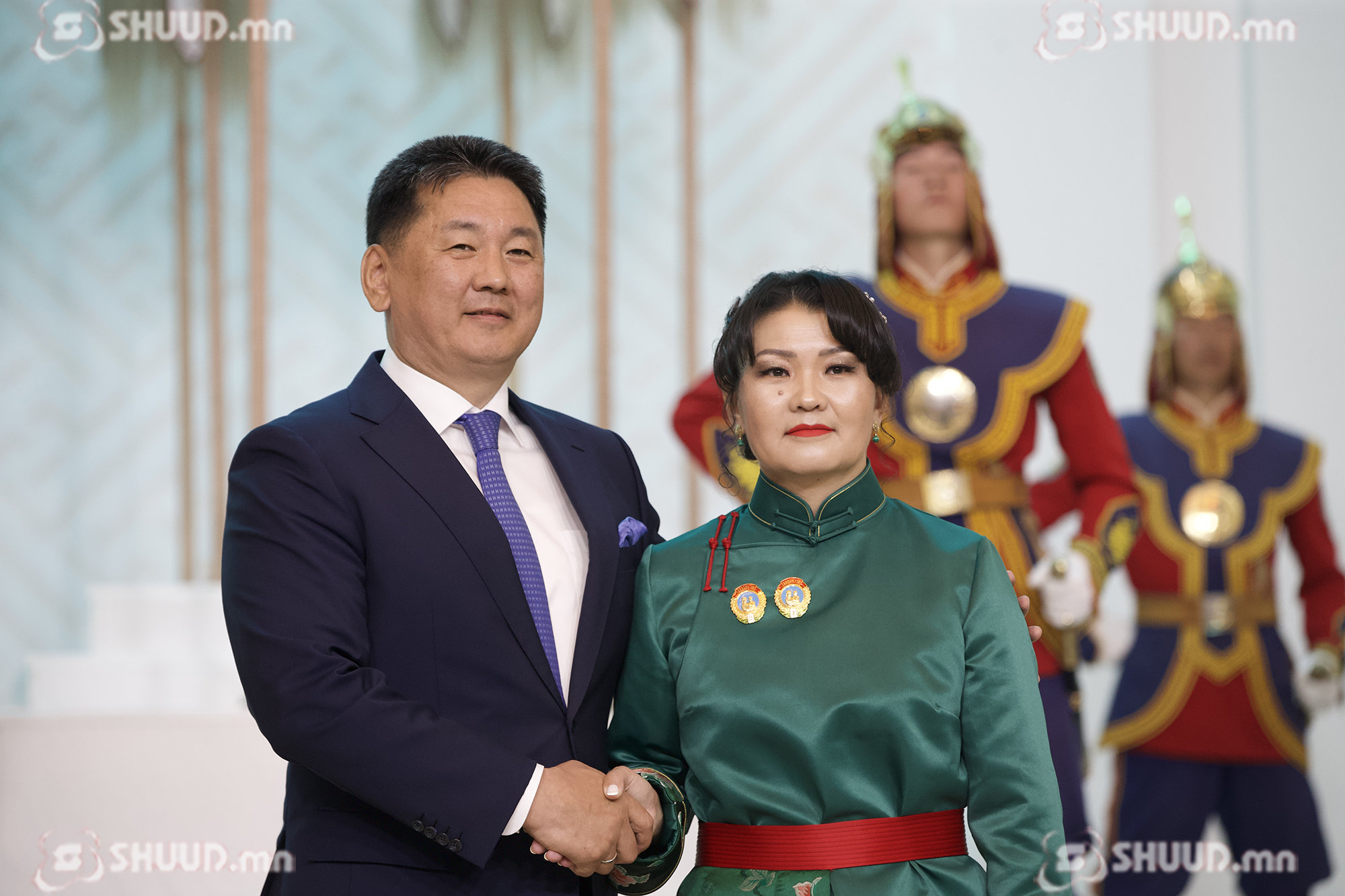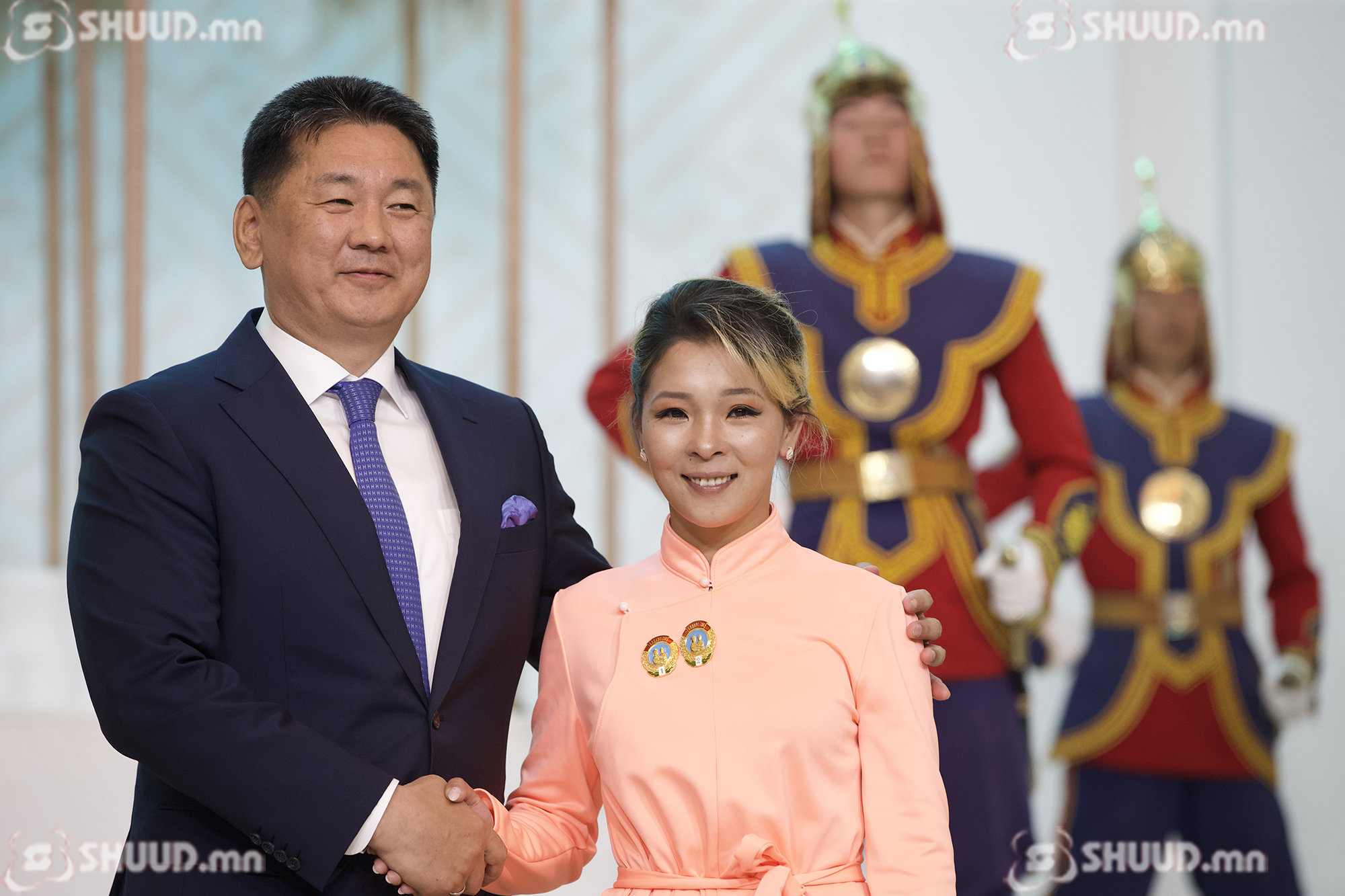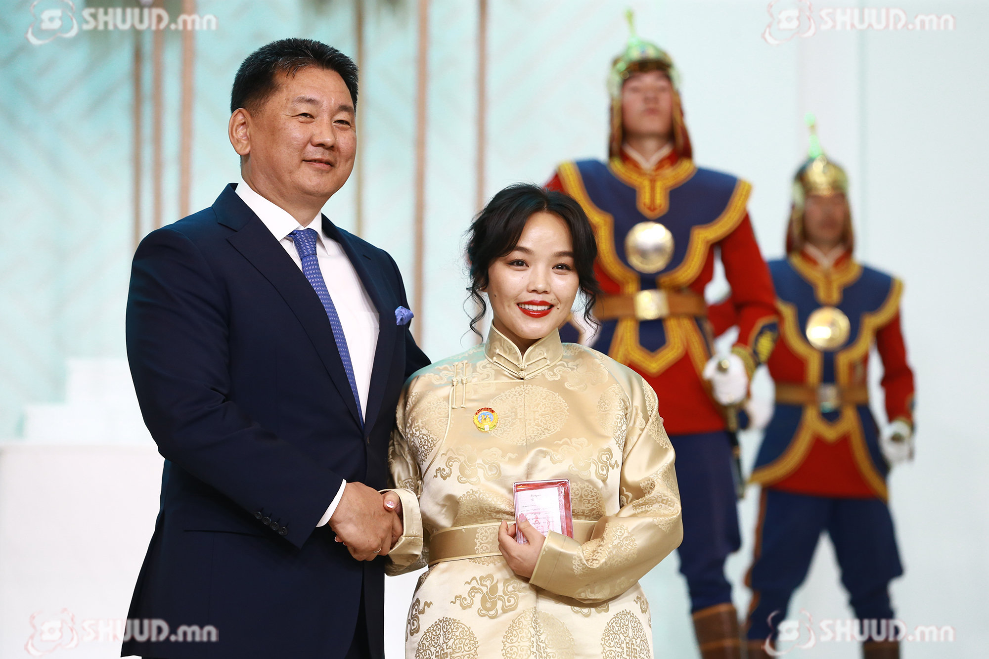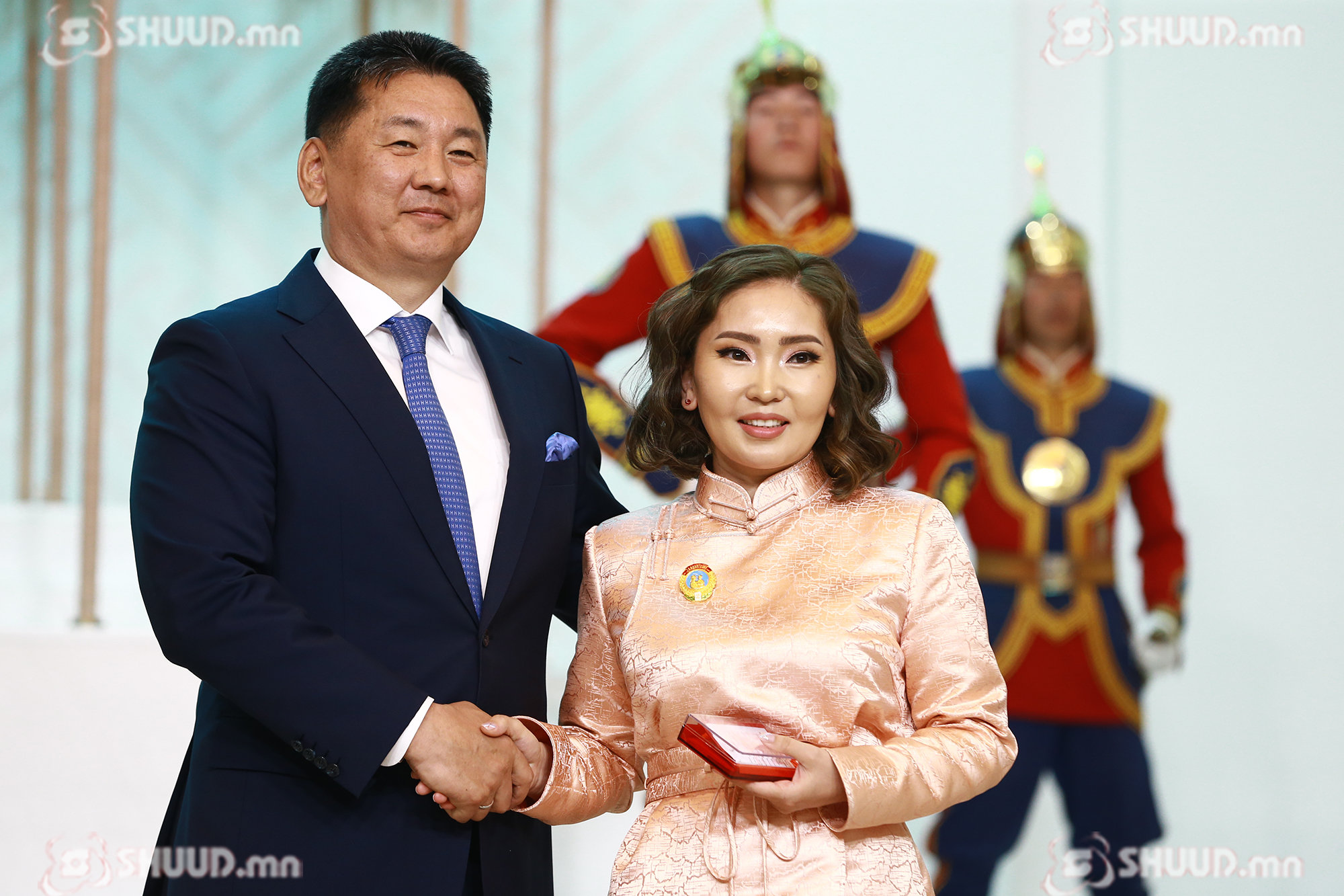Монгол Улсын Ерөнхийлөгч У.Хүрэлсүх "Эхийн алдар" одон гардуулж байна. “Эхийн алдар” I, II зэргийн одонг Б.Баасанжаргал, Г.Ганцэцэг, Ч.Золжаргал, Т.Золзаяа нарт хүртээлээ.