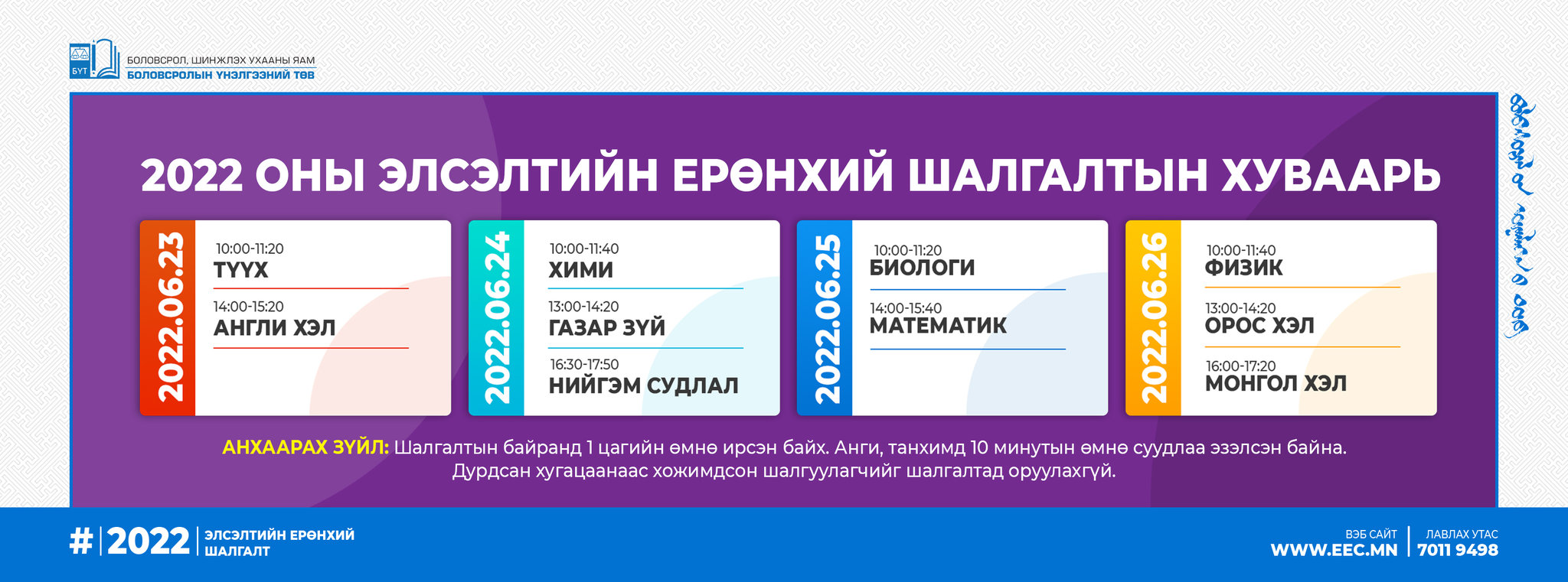 Энэ жилийн ЭЕШ зургаадугаар сарын 23-26-ны өдрүүдэд улс орон даяар зохион байгуулагдана. Иймд ЭЕШ-ын зохион байгуулалт, шалгалтын агуулга зэрэг асуудлын талаар БҮТ-ийн ЭЕШ хариуцсан ахлах мэргэжилтэн Д.Энхжаргалаас тодрууллаа.