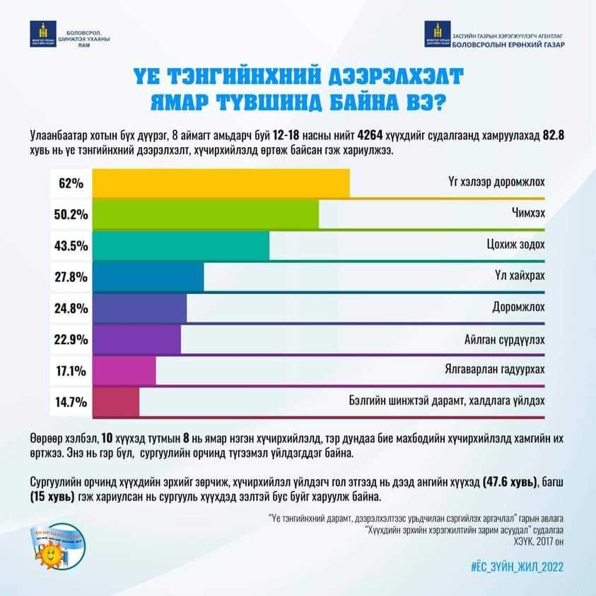 Улаанбаатар хотын бүх дүүрэг, найман аймагт амьдарч буй 12-18 насны нийт 4264 хүүхдийг судалгаанд хамруулахад Үе тэнгийнхний дээрэлхэлт ямар түвшинд байна вэ гэх асуултад 82.8 хувь нь үе тэнгийнхний дээрэлхэлт, хүчирхийлэлд өртөж байсан гэж хариулжээ.