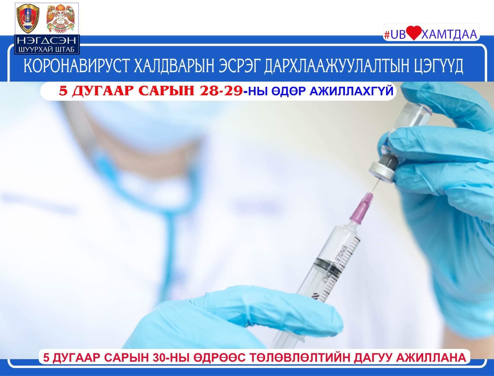2022 оны 5 дугаар сарын 28-29-ний өдрүүдэд дархлаажуулалтын цэгүүд ажиллахгүй. Тавдугаар сарын 30-ны даваа гарагаас төлөвлөлтийн дагуу ажиллана.