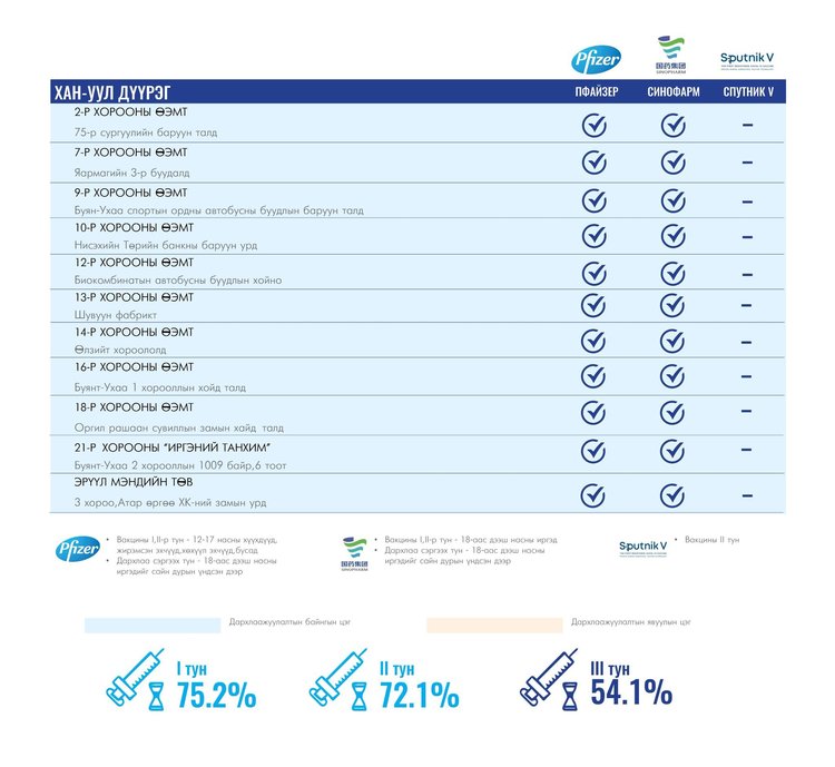 Өнөөдөр Улаанбаатар хотод суурин 38 цэг, түр 2 цэгт 40 багийн 138 эмч, ажилтан ажиллана. Та өөрт ойр вакцины аль ч цэгт очиж дархлаажуулалтад хамрагдах боломжтой. Дархлаажуулалтын цэгүүд 09:00-16:00 цаг хүртэл ажиллана.