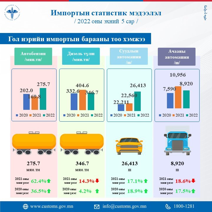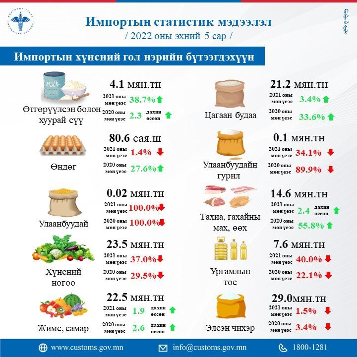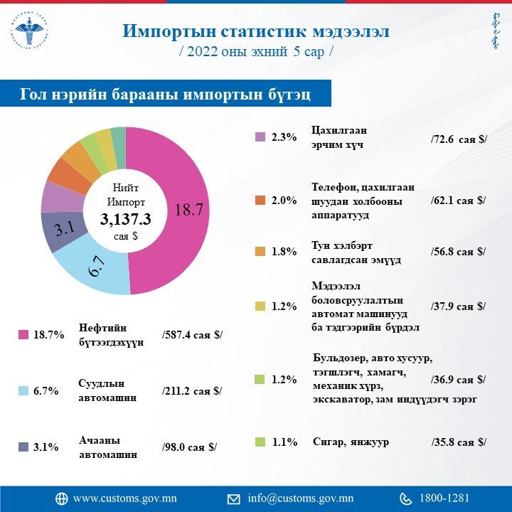 Манай улс 2022 оны эхний 5 сард 3137.3 сая ам.долларын бараа, түүхий эд импортоор авчээ. Энэ нь 2021 оны мөн үеэс 535.7 сая ам.доллараар буюу 20.6 хувиар өссөн үзүүлэлт юм.