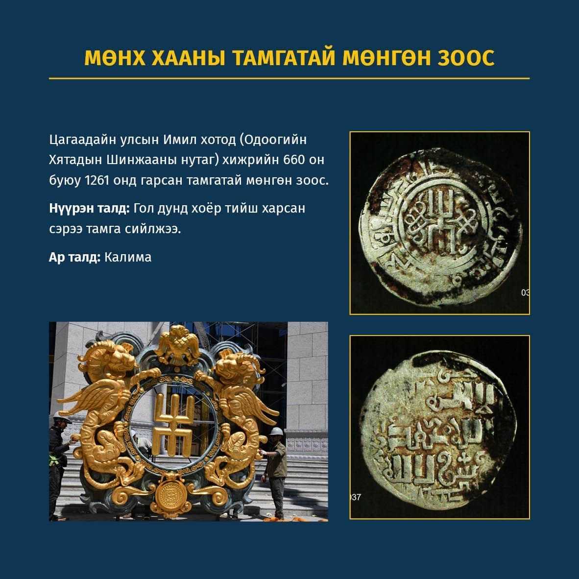 Аливаа улс орны сүлдэнд өөрийнх нь газар нутгаас илэрсэн археологийн олдвор дээрх өвөг дээдсийнх нь сүр хүчний бэлгэдэл болсон дүрс агуулагдсан байдаг. Энэ жишгээр таван их хааны тамга тус бүрийн дээд талд эртний төрт улсуудын сүлд шүтээн шонхор, галт шувуу зэргийг дүрсэлсэн бол тамганы доод талд тухайн хааны үед хэрэглэж байсан зоосон мөнгийг урлажээ. Их хаадын дэлдүүлсэн эдгээр зоосон дээр тухайн хааны нэр, тамгыг дүрсэлсэн байдаг.