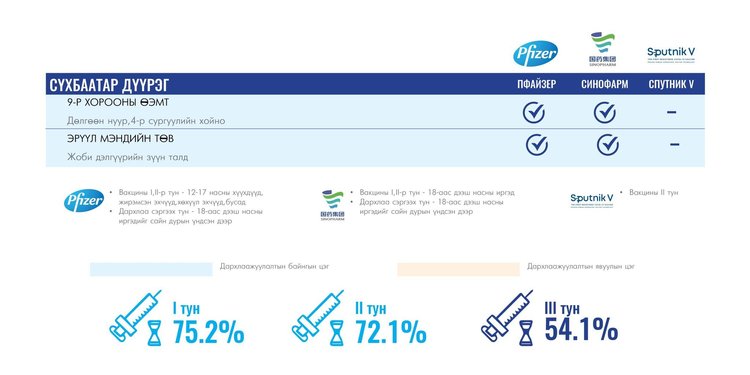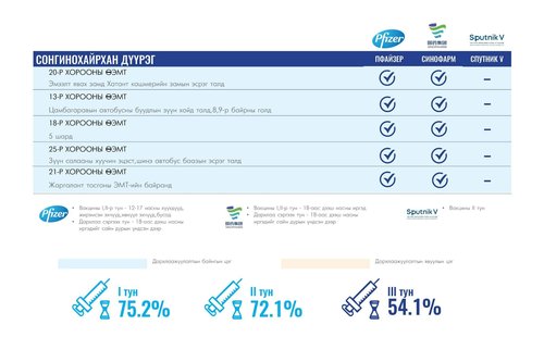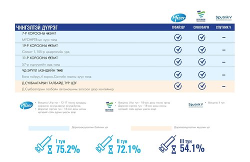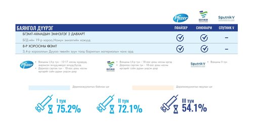 Өнөөдөр Улаанбаатар хотод суурин 31 цэг, түр 2 цэгт 33 багийн 110 эмч, ажилтан ажиллана. Та өөрт ойр вакцины аль ч цэгт очиж дархлаажуулалтад хамрагдах боломжтой. Дархлаажуулалтын цэгүүд 09:00-16:00 цаг хүртэл ажиллана.