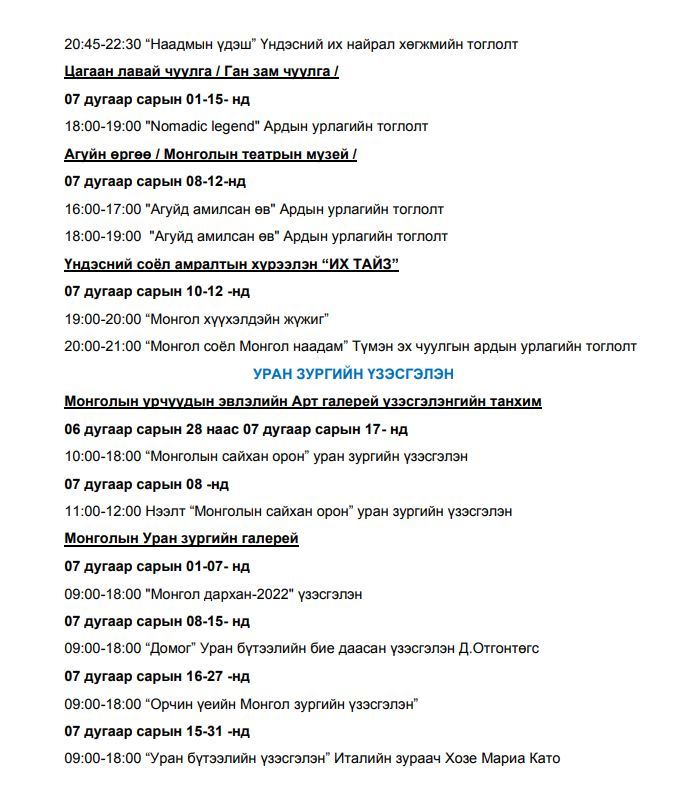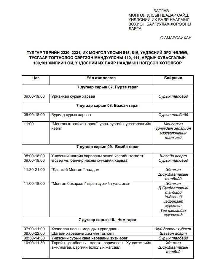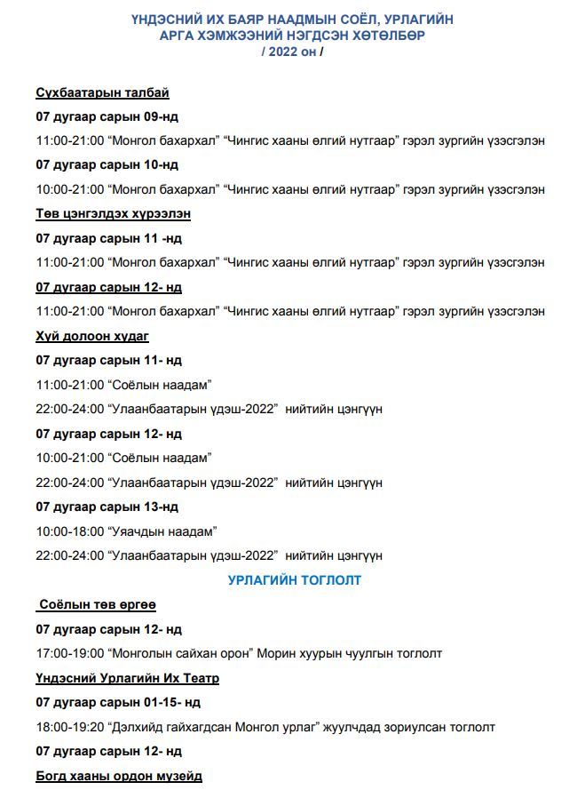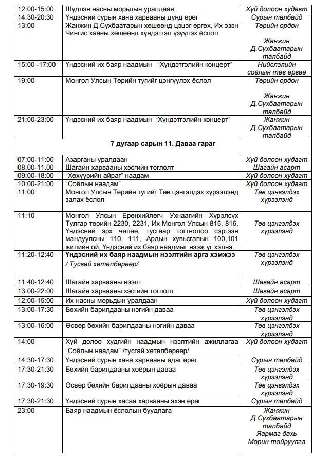 Тулгар төрийн 2230, 2231, Их Монгол Улс байгуулагдсаны 815, 816, Үндэсний эрх чөлөө, тусгаар тогтнолоо сэргээн мандуулсны 110, 111, Ардын хувьсгалын 100, 101 жилийн ойн Үндэсний их баяр наадмын хөтөлбөрийг хүргэж байна.