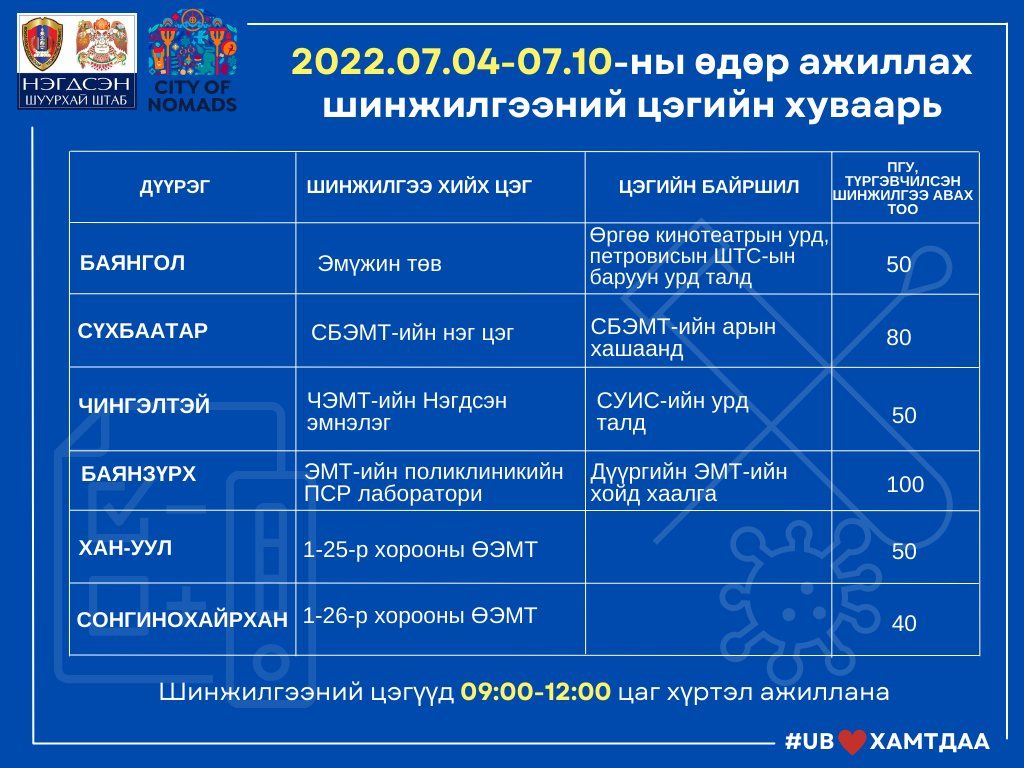 Энэ сарын 4-10-ны өдөр ажиллах шинжилгээний цэгийн хуваарийг хүргэж байна. Шинжилгээний цэгүүд 09.00-12.00 цаг хүртэл ажиллана.