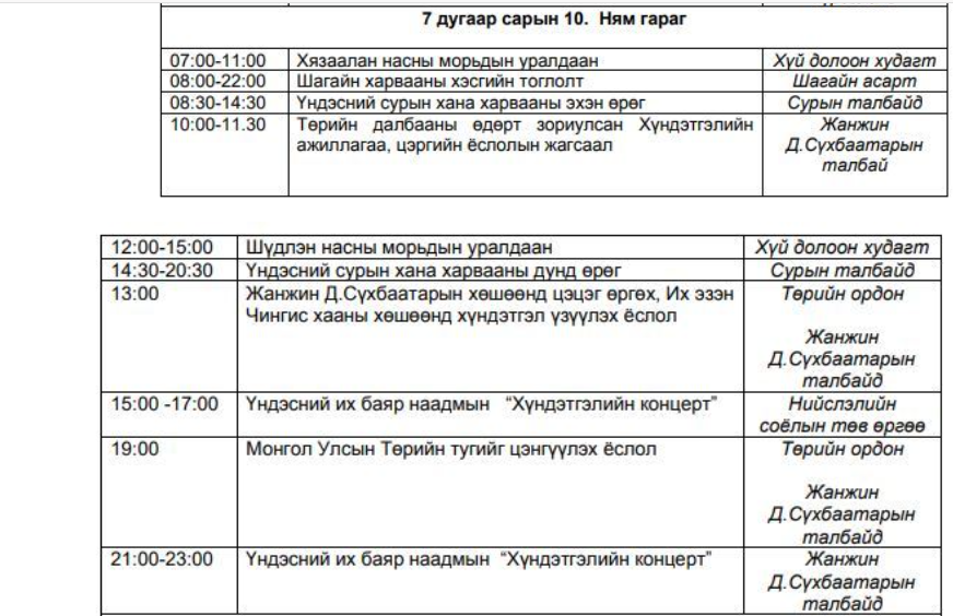Тулгар төрийн 2230, 2231, Их Монгол Улс байгуулагдсаны 815, 816, Үндэсний эрх чөлөө, тусгаар тогтнолоо сэргээн мандуулсны 110, 111, Ардын хувьсгалын 100, 101 жилийн ойн Үндэсний их баяр наадмын өнөөдрийн хөтөлбөрийг хүргэж байна.