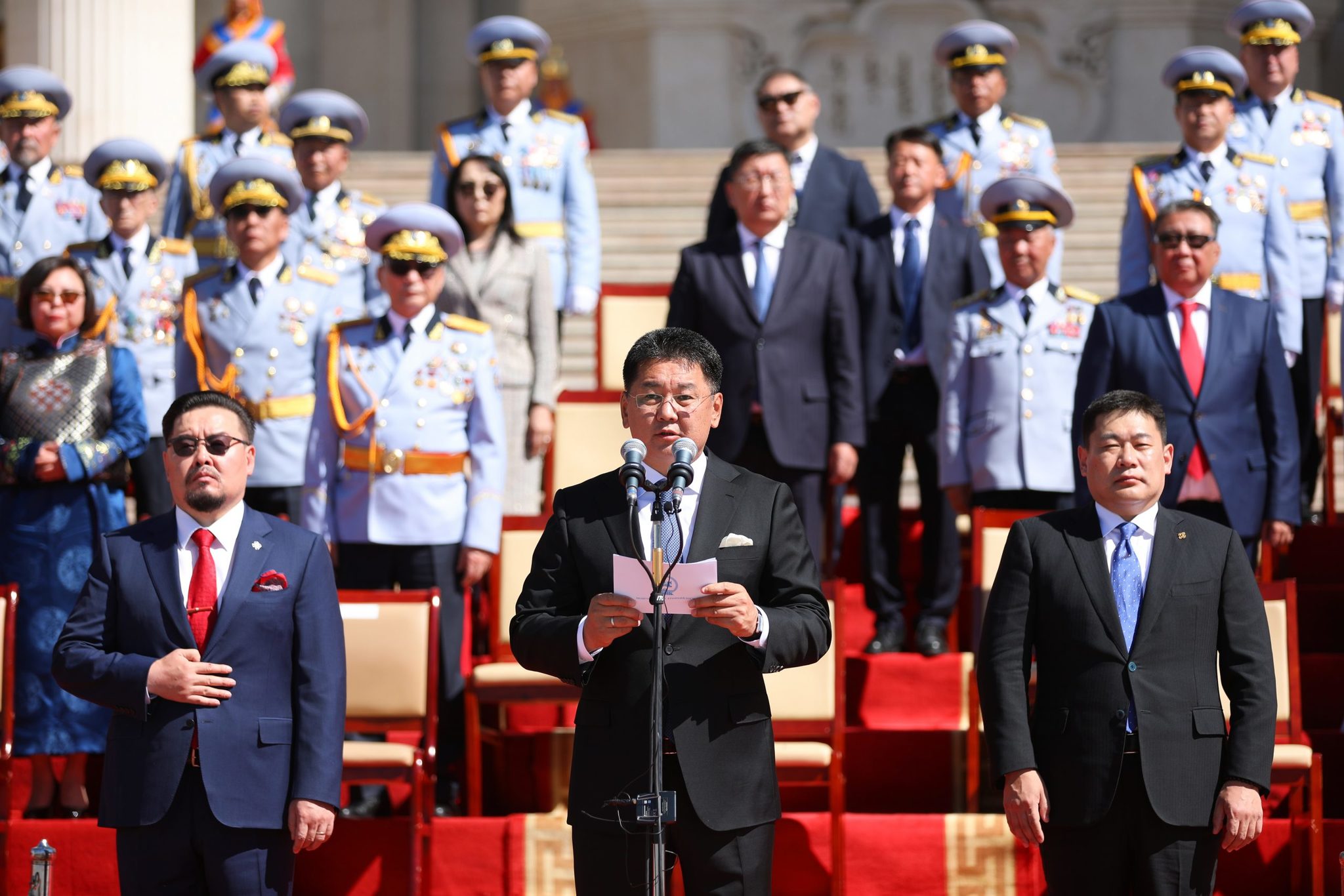 Энэхүү түүхэн тэмдэглэлт өдрөөр улс орныхоо тусгаар тогтнол, нутаг дэвсгэр, хилийн халдашгүй дархан байдал, ард түмнийхээ амар тайван, аюулгүй байдлын төлөө тангараг өргөсөн төрийн цэргийн болон хууль сахиулах байгууллагын алба хаагчид сүр хүчээ илтгэн Төрийн далбаандаа хүндэтгэл үзүүлэхээр цэргийн ёслолын жагсаалдаа жигдрэн жагсаж байна.