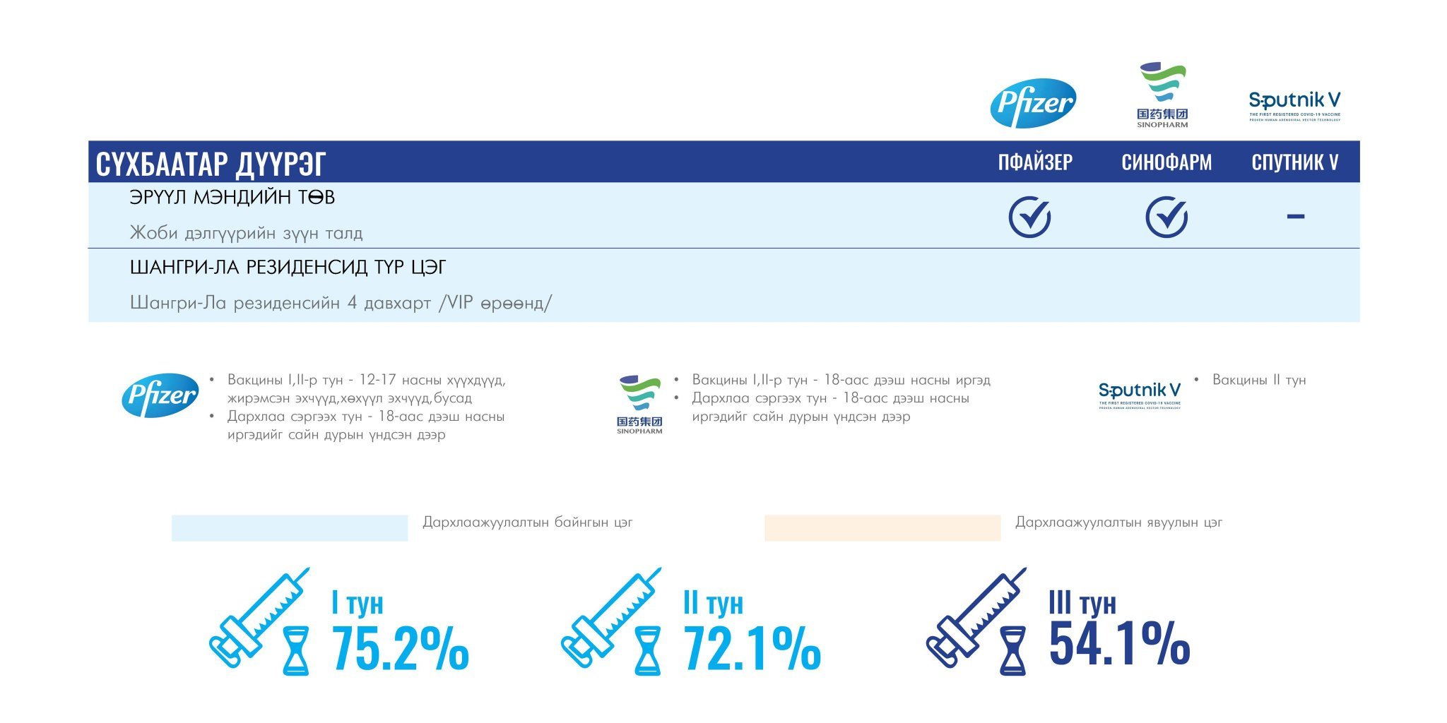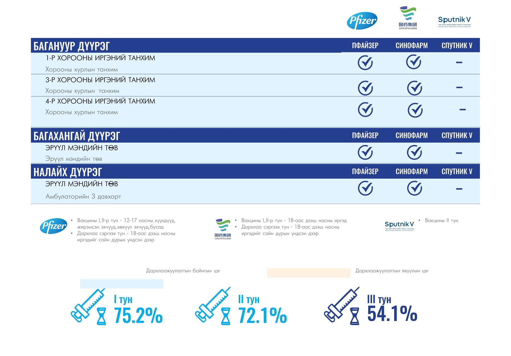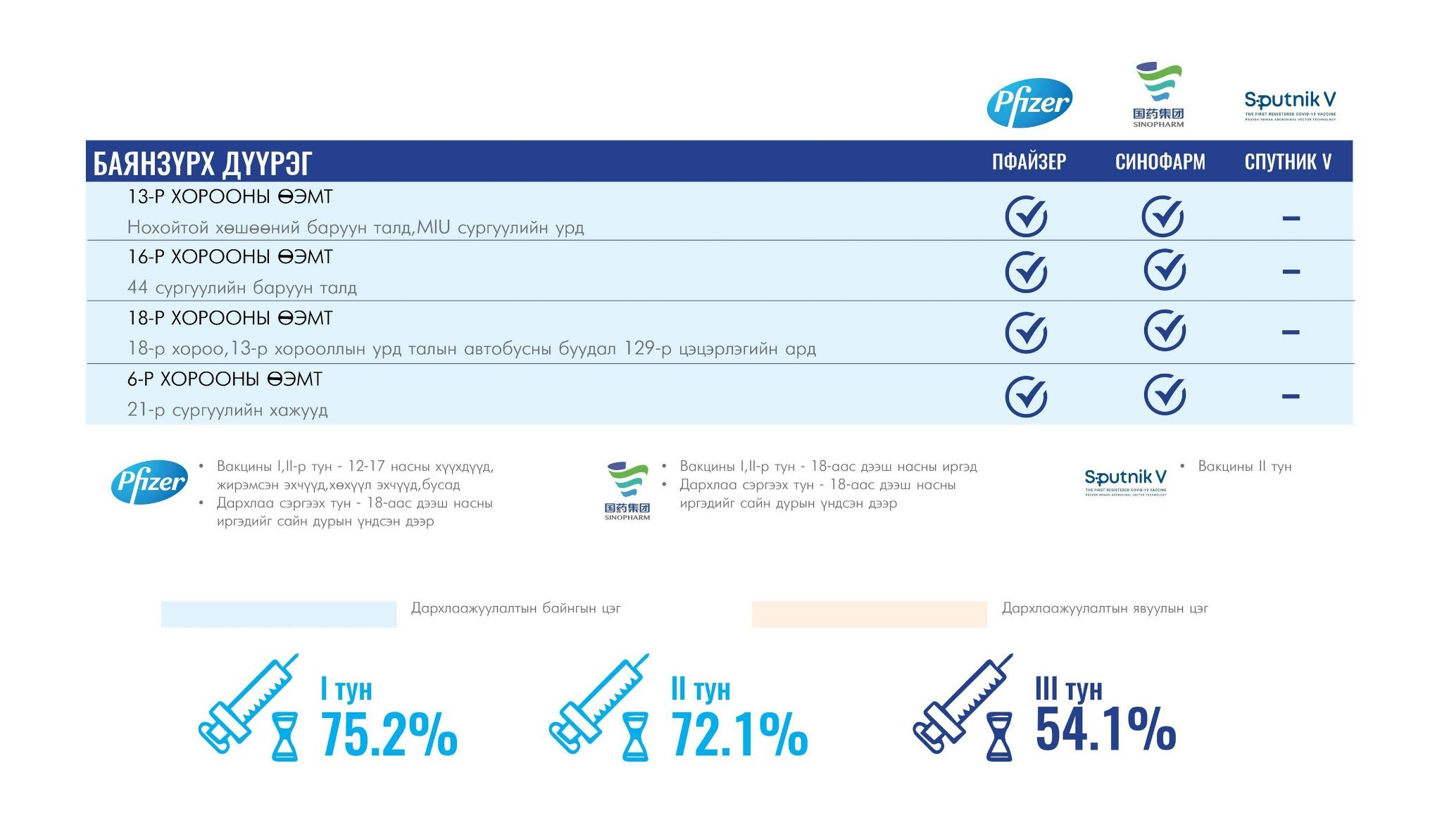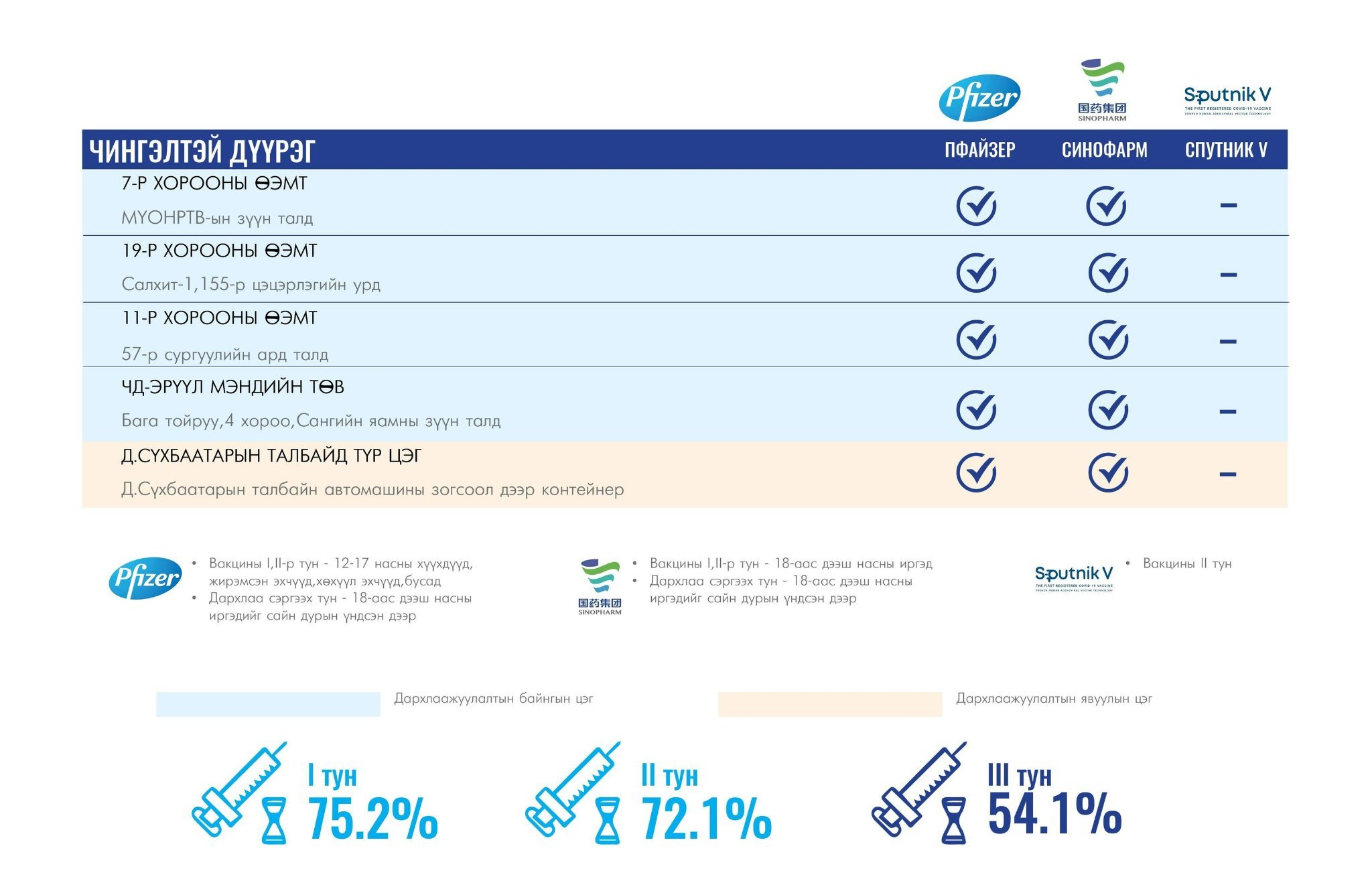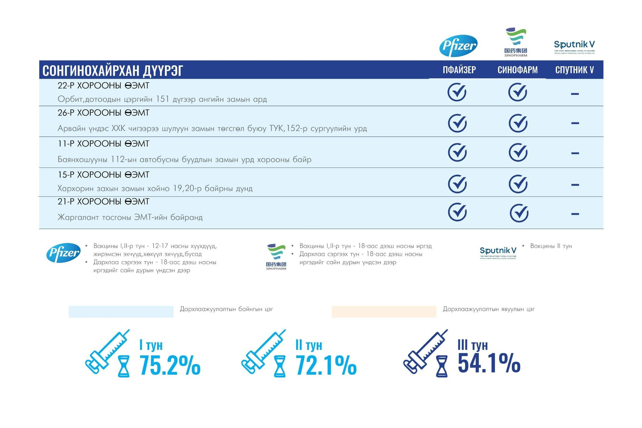 Өнөөдөр Улаанбаатар хотод суурин 25 цэг, түр 2 цэгт 27 багийн 92 эмч, ажилтан ажиллана. Та өөрт ойр вакцины аль ч цэгт очиж дархлаажуулалтад хамрагдах боломжтой. Дархлаажуулалтын цэгүүд 09:00-16:00 цаг хүртэл ажиллана.