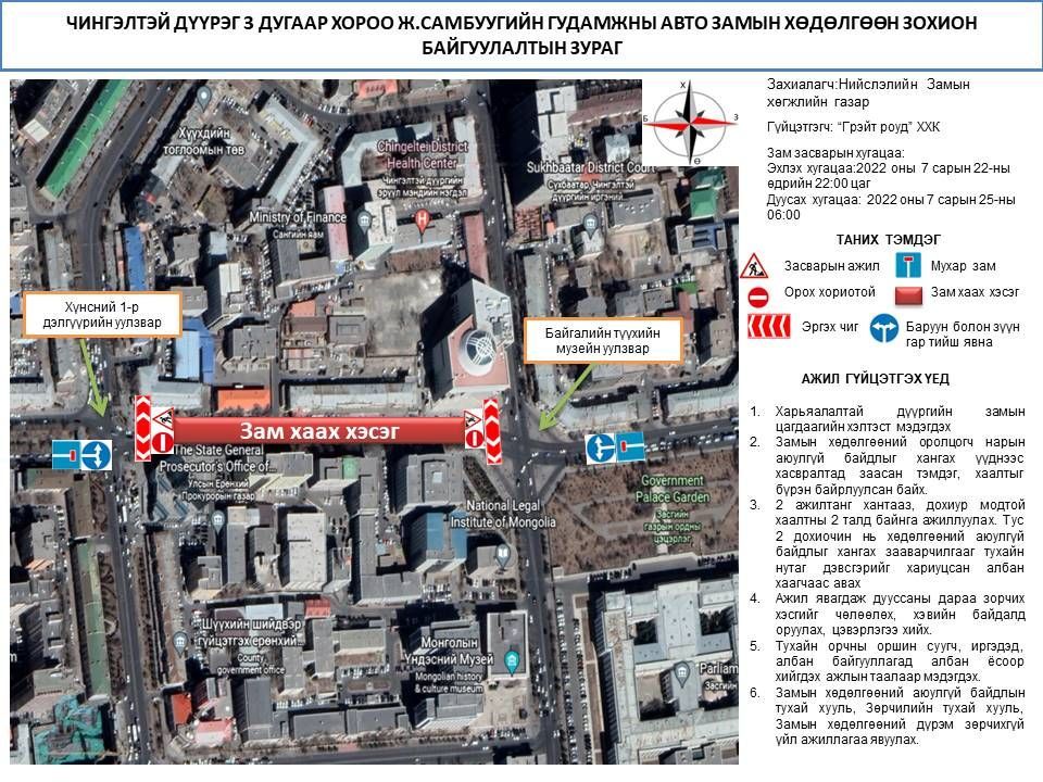 Тодруулбал, маргааш буюу долоодугаар сарын 22-ны 22:00 цагаас долоодугаар сарын 25-ны 06:00 цагийн хооронд Хүнсний 1-р дэлгүүрийн уулзвараас Байгалийн түүхийн музейн зүүн урд талын уулзвар хүртэл замын хөдөлгөөнийг хязгаарлах юм.