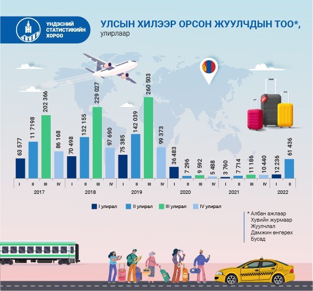 Манай улсад 2022 оны эхний хагас жилийн байдлаар 73.7 мянган жуулчин иржээ. Энэ нь өмнөх оны мөн үеэс 6.4 дахин өссөн үзүүлэлт бөгөөд цар тахлын өмнөх үе буюу 2019 оны эхний хагас жилтэй харьцуулахад 66.1 хувиар буурсан үзүүлэлт юм.