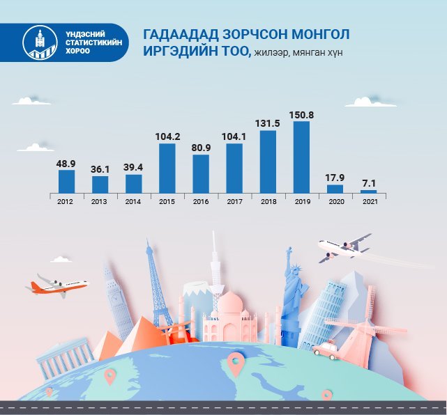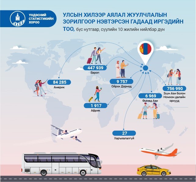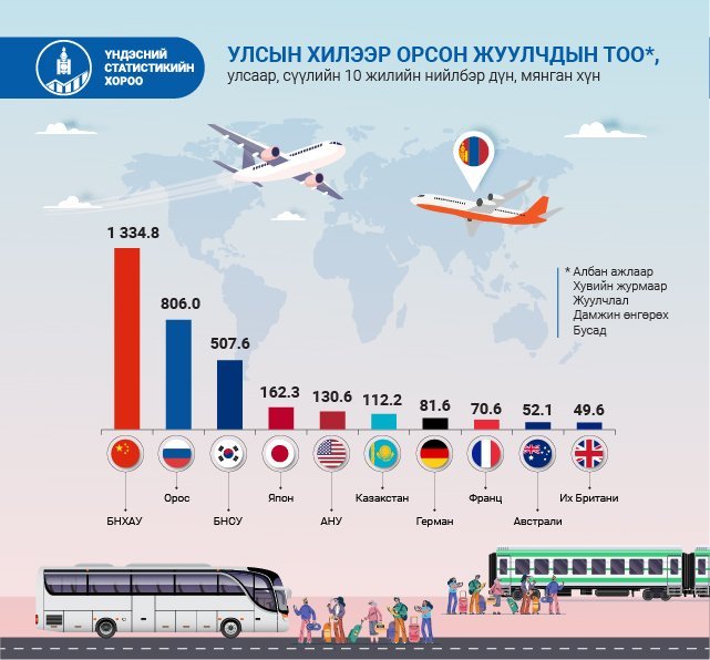 Сүүлийн 10 жилийн тоон үзүүлэлтийг харвал БНХАУ-аас 1.3 сая, ОХУ-аас 806 мянга, БНСУ-аас 507 мянга орчим жуулчин Монгол Улсад аялахаар иржээ.