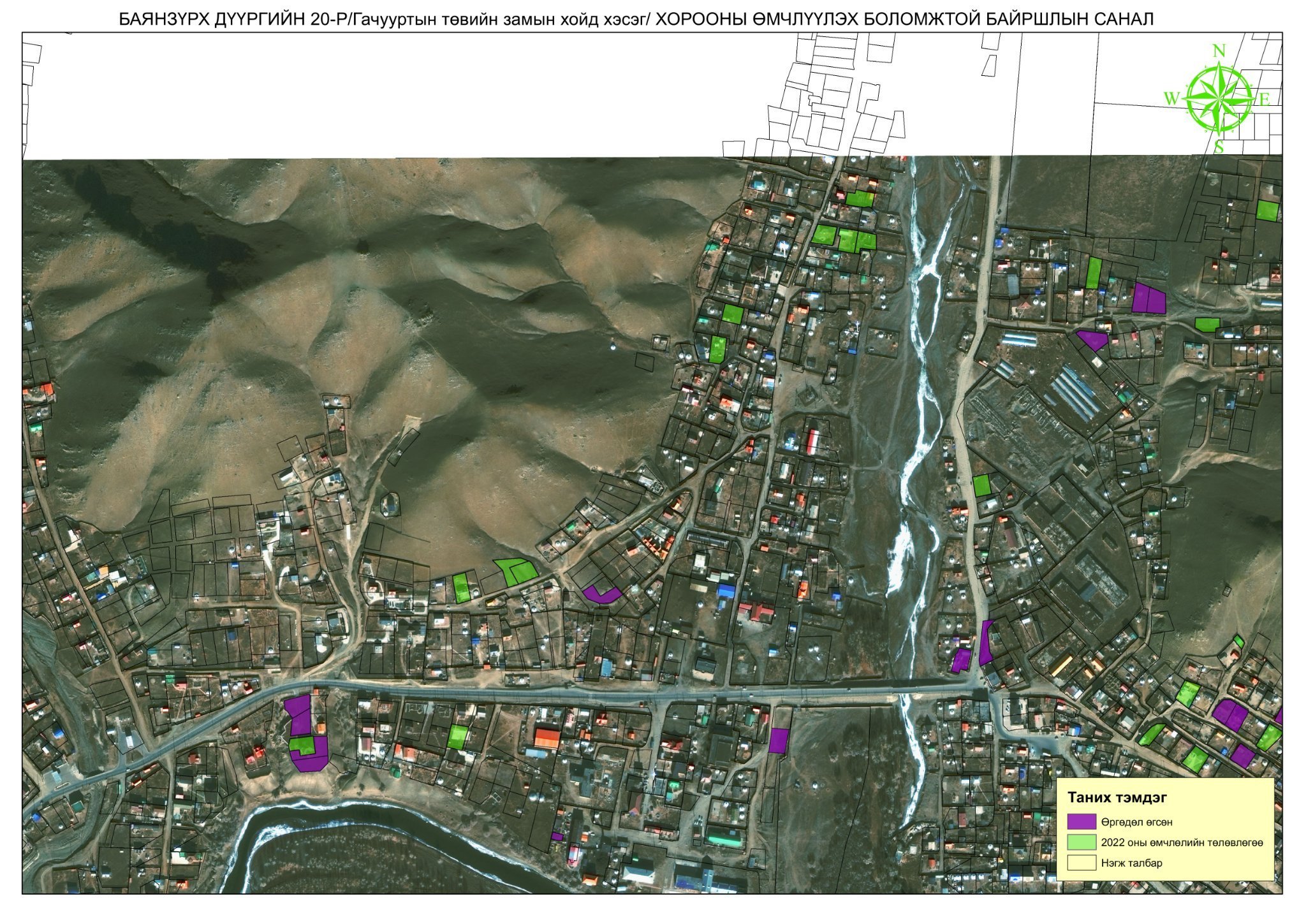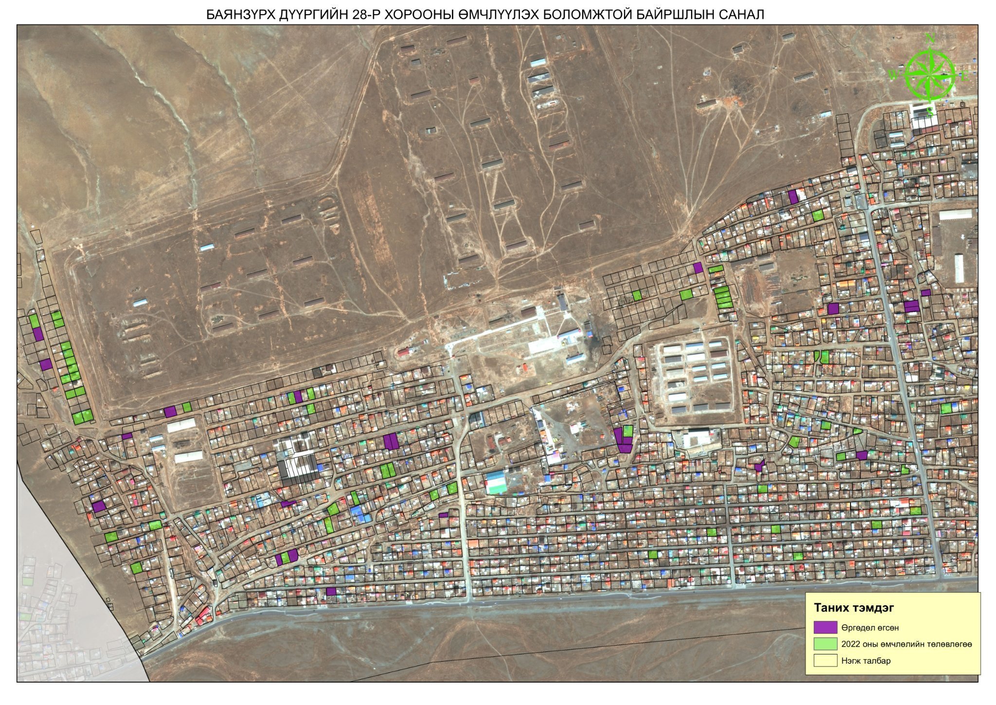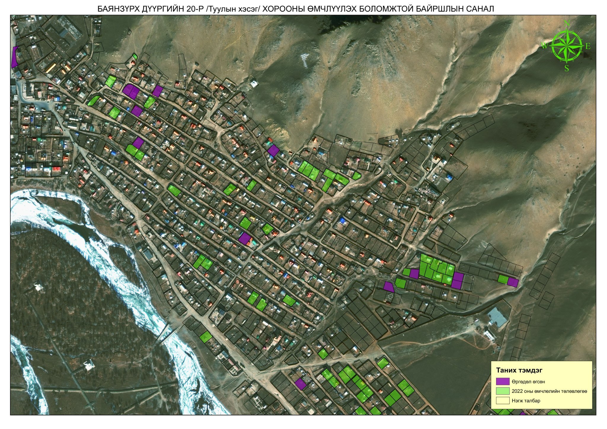 Монгол Улсын иргэнд газар өмчлүүлэх тухай хууль, Монгол Улсын Засгийн газрын 121 дүгээр тогтоол, НИТХ-ын 11/33 дугаар тогтоолыг хэрэгжүүлэх зорилгоор нийслэлийн 2022 оны газар зохион байгуулалтын төлөвлөгөөнд 1249 иргэний эзэмшиж буй газрыг өмчлүүлэхээр тусгажээ.