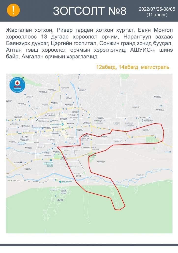 Энэ хугацаанд нэр дурдсан байршлуудын харъяа ОСНААКонторууд мөн өөрийн эзэмшлийн шугам тоноглолд ээлжит засвар үйлчилгээгээ амжиж хийх шаардлагатай байдаг ба зарим тохиолдолд хугацаа өөрчлөгдөх магадлалтай тул хэрэглэгч та лавлах тодруулах зүйлсээ манай шуурхай албаны 7004-7005 тоот утсаар болон харъяа орон сууцны контороос мэдээллээ авах боломжтой.