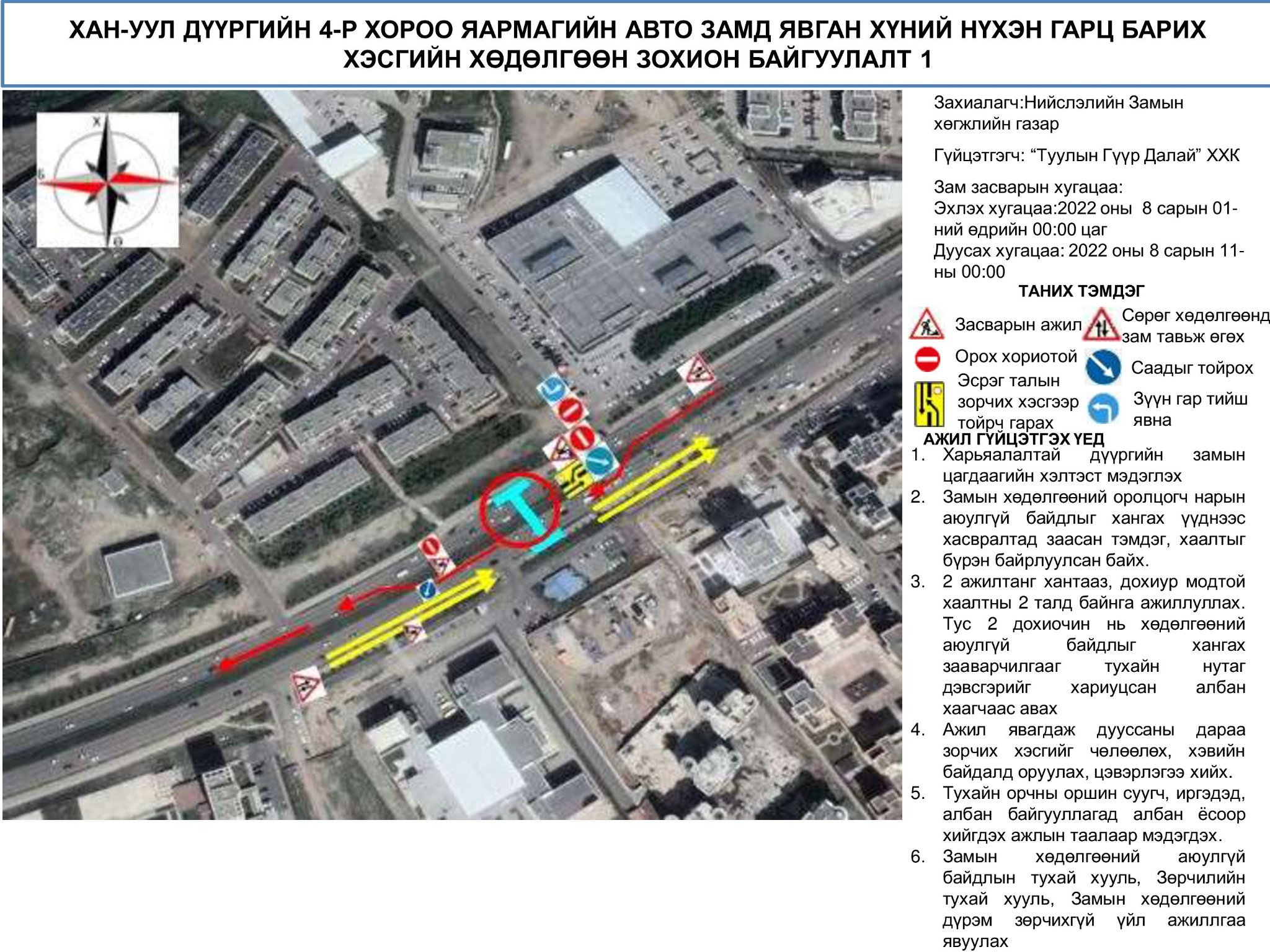 • 2022 оны 08 дугаар сарын 11-ээс 2022 оны 08 дугаар сарын 22-ны хооронд баруунаас зүүн тийш чиглэсэн тээврийн хэрэгслийн хөдөлгөөн зохион байгуулалтад өөрчлөлт оруулан явган хүний нүхэн гарц байгуулах ажил хийгдэх гэж байна. Иймд иргэд жолооч та бүхэн энэ хугацаанд тэмдэг тэмдэглэгээний дагуу хөдөлгөөнд оролцоно уу.