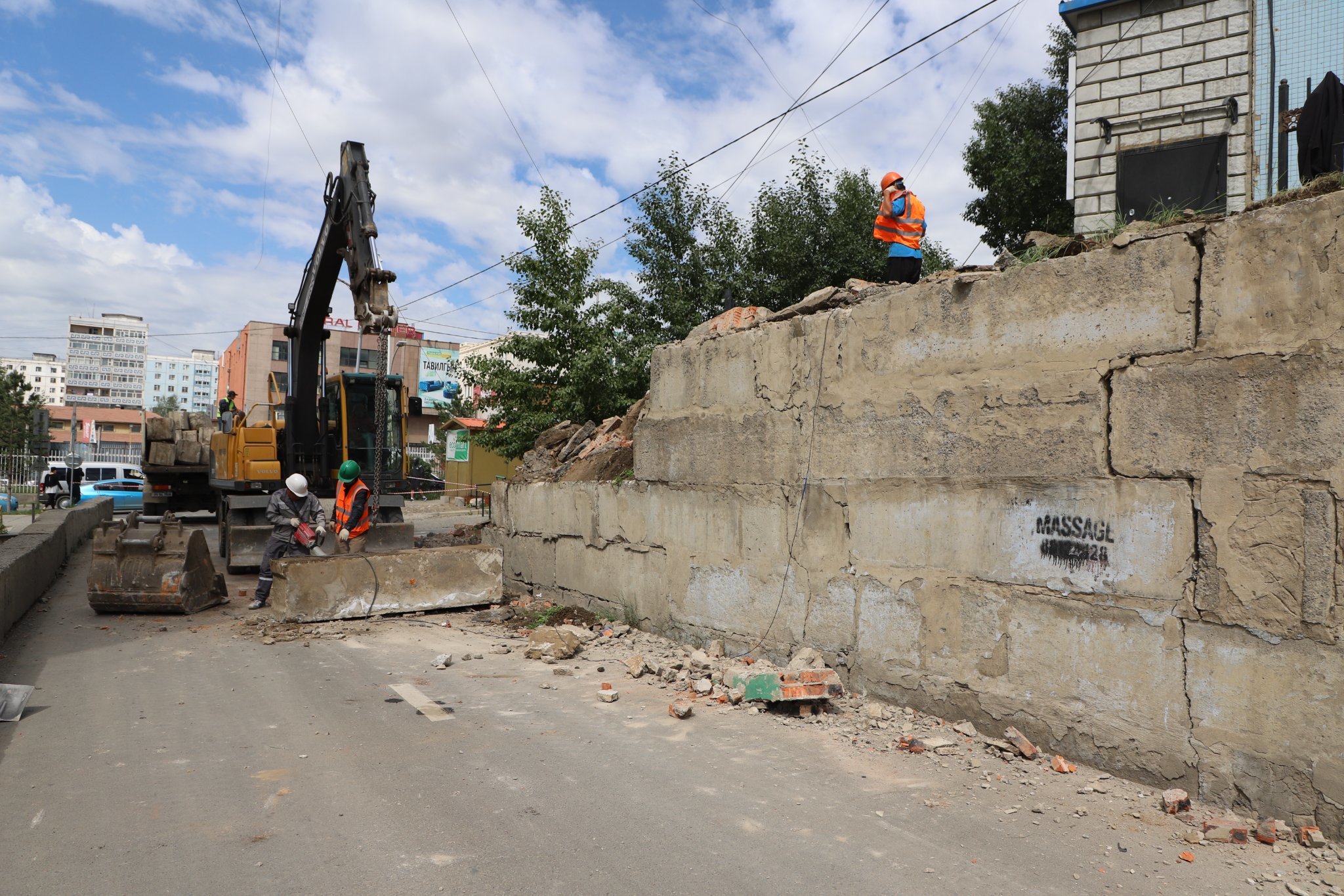 Нурах эрсдэл үүссэн түшиц ханыг засварлаж байна