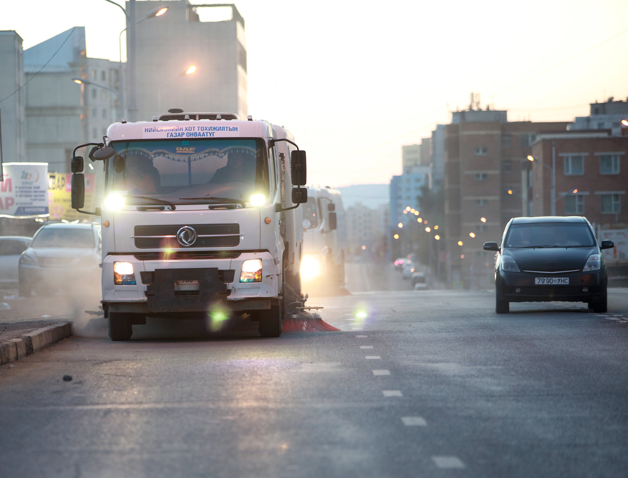 -Авто замын хашлага, нуух хэсгийг бүрэн цэвэрлэх, тоосжилтыг бүрэн соруулах үүднээс хоёр машиныг ар араас нь явуулдаг. Энэ хоёр машины өдрийн норм 70-80 мянган ам метр талбай. Шүүрт машинд APU, MCS компаниудын хэрэглээнээс гарсан саарал усыг голчлон ашигладаг. Усалгаа, чийгшүүлэлтэд мөн саарал ус ашигладаг. Нэг машин 3-4 тонны багтаамжтай байдаг.