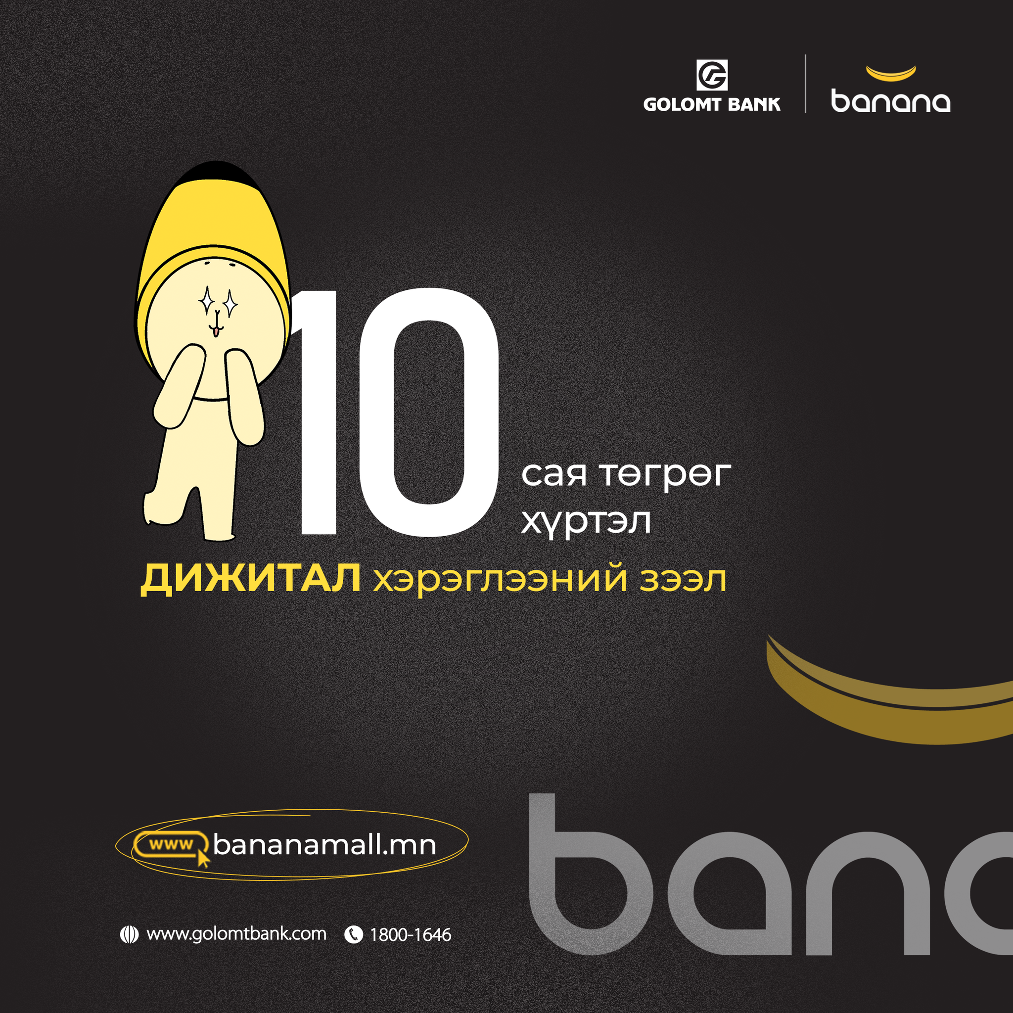 Та хурдан, шуурхай, хялбар нөхцөлөөр хэрэглээний зээл авахыг хүсэж байна уу? Тэгвэл Голомт банк Bananamall.mn-тэй хамтран дижитал хэрэглээний зээлийг олгож эхэллээ. Та өөрт хэрэгцээтэй барааг Bananamall.mn онлайн худалдааны вэбсайтаас сонгоод, Голомт банкны урьдчилгаагүй, бага хүүтэй зээлээр худалдан авах боломжтой боллоо. Та Bananamall.mn вэбсайтаар дамжуулан зээлийн хүсэлтээ онлайнаар илгээх ба бид таны зээлийг 1-10 минутын дотор шийдвэрлэн олгох болно.
