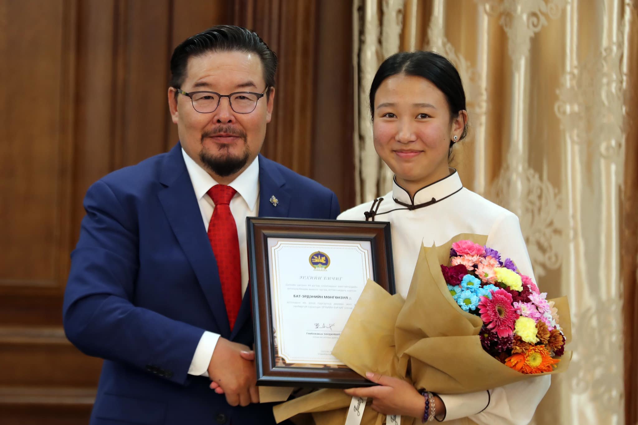 Мөн өөрийн цахим хуудсандаа "Б.Мөнгөнзул Шатрын олимп-д алтан медаль авч, 17 насандаа ОЛИМПЫН АНХНЫ АЛТАН МЕДАЛЬ-ийн эзэн болсон. Б.Мөнгөнзулдаа спортын өндөр амжилт хүсье" хэмээн нийтэлсэн байна.