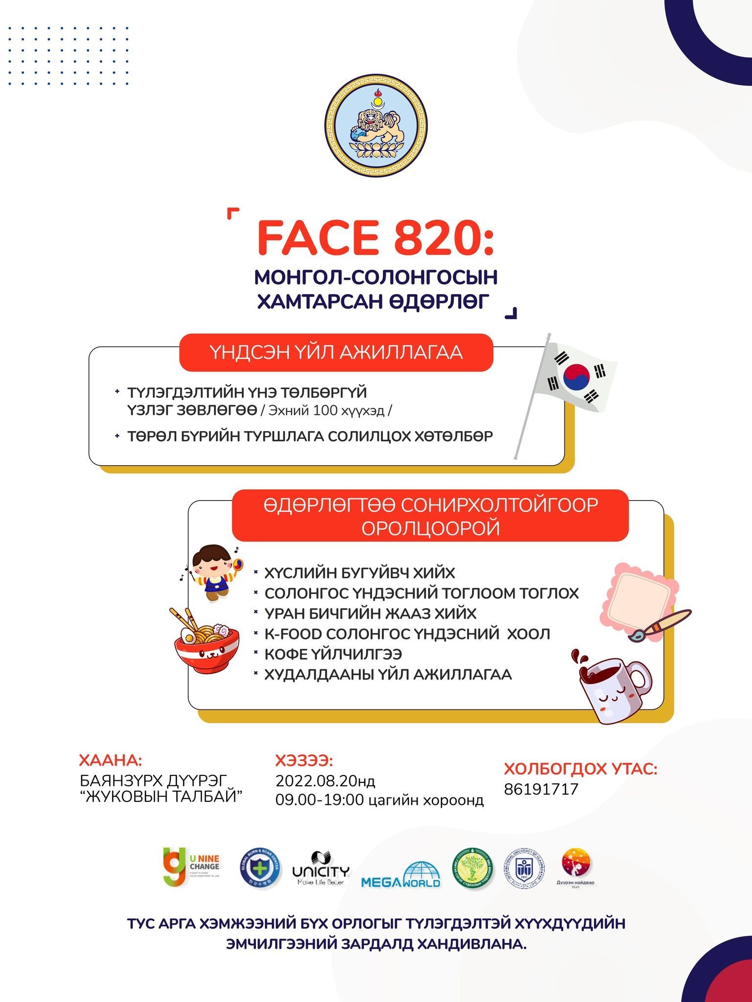 “U Nine Change” БНСУ-ын хүмүүнлэгийн байгууллага энэхүү арга хэмжээг зохион байгуулж байгаа бөгөөд Баянзүрх дүүргийн ЗДТГ дэмжин оролцож байна. Өдөрлөгийн үеэр Солонгос үндэсний хоолноос амталж, тоглоом тоглох, худалдааны арга хэмжээнд оролцох боломжтой.