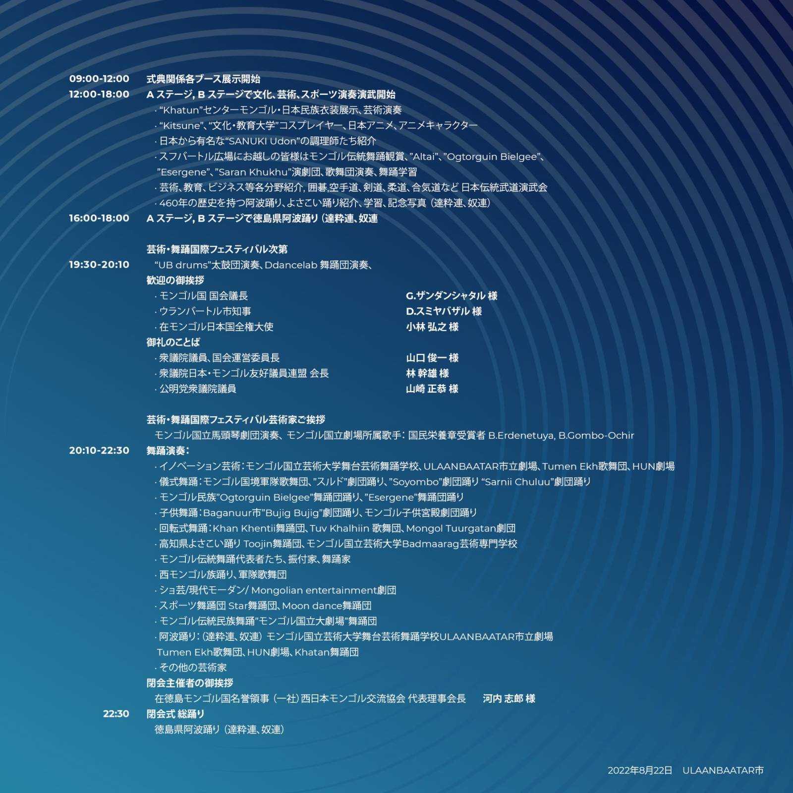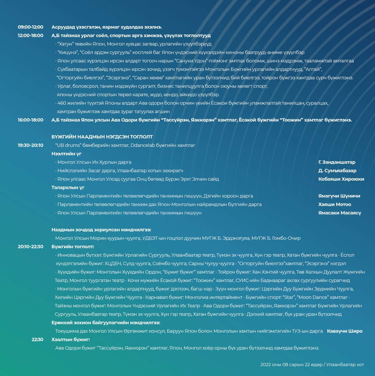 Тус өдөрлөгт оролцож монгол, япон үндэсний бүжиг, соёлтой танилцах хүсэлтэй иргэд дараах хөтөлбөртэй танилцана уу.