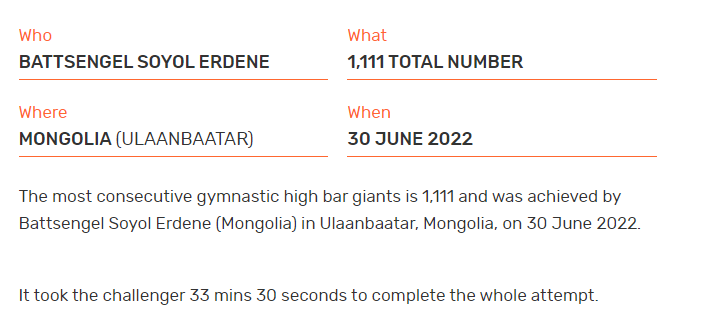 Өндөр турник дээр эргэх уг төрөлд дэлхийн дээд амжилтыг Армени улсын тамирчин 1001 удаа тасралтгүй эргэж тогтоосон байдаг бол ийнхүү Монгол залуу 1111 удаа эргэж шинэ рекорд тогтоолоо.