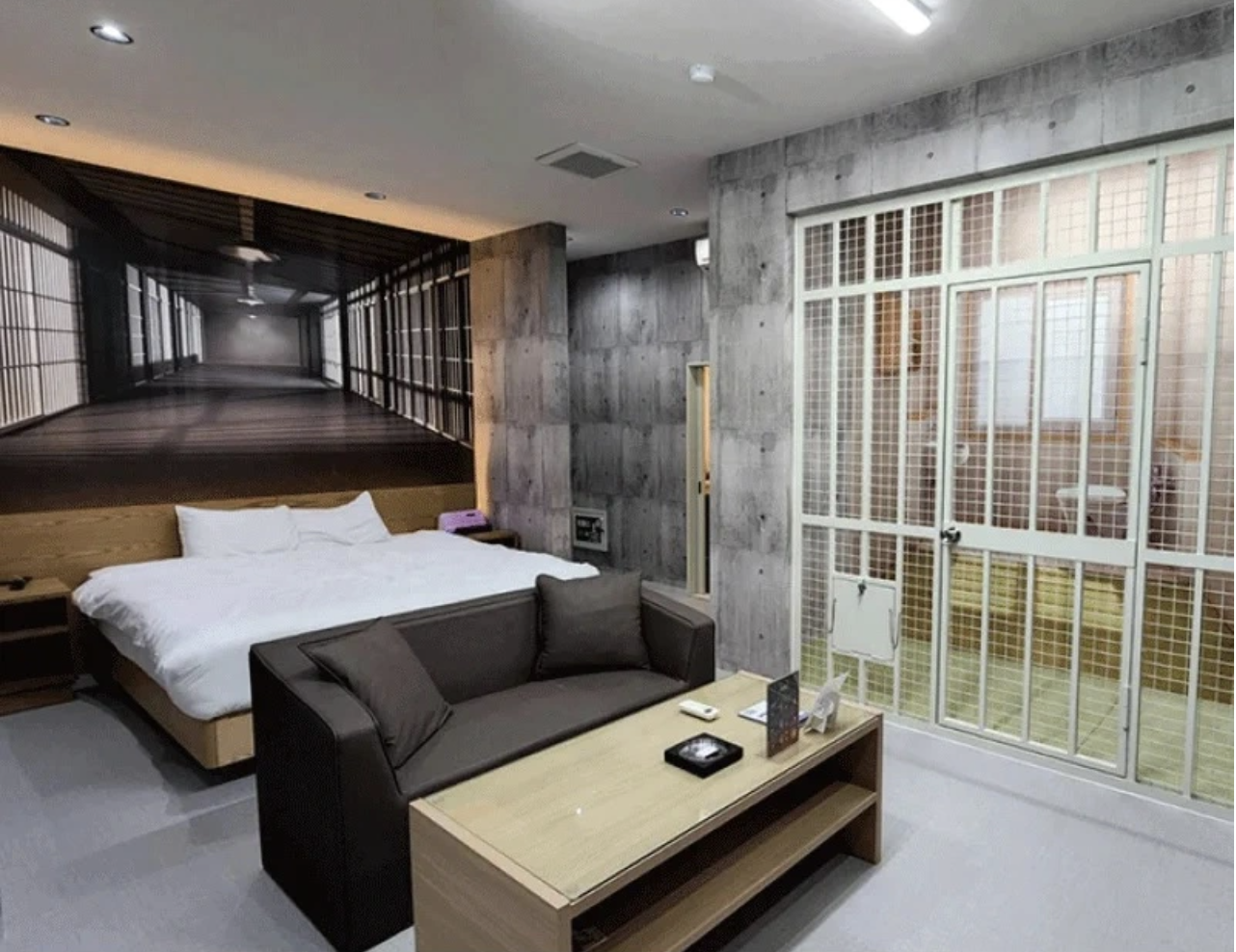 Эх сурвалжийн мэдээлснээр, зочид буудал нийтдээ найман өрөөтэй аж. Нэг өрөө нь саарал хана, хатуу вандан, жинхэнэ тороор хийсэн хаа гээд шоронгийн камерын хэв маягаар хийгджээ. Харин өөр нэг өрөөг цагдаагийн газрын мэдүүлэг өгөх өрөө шиг тохижуулсан байна.