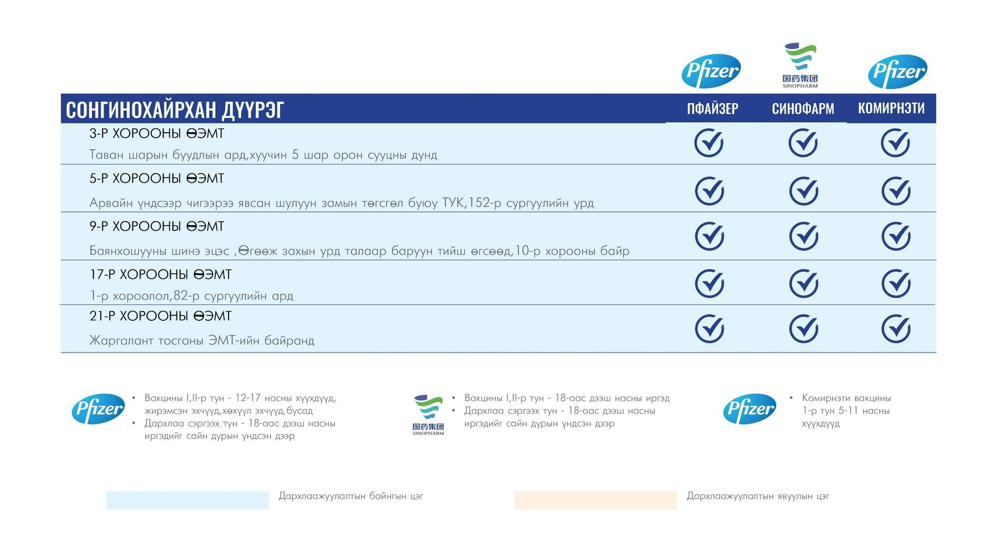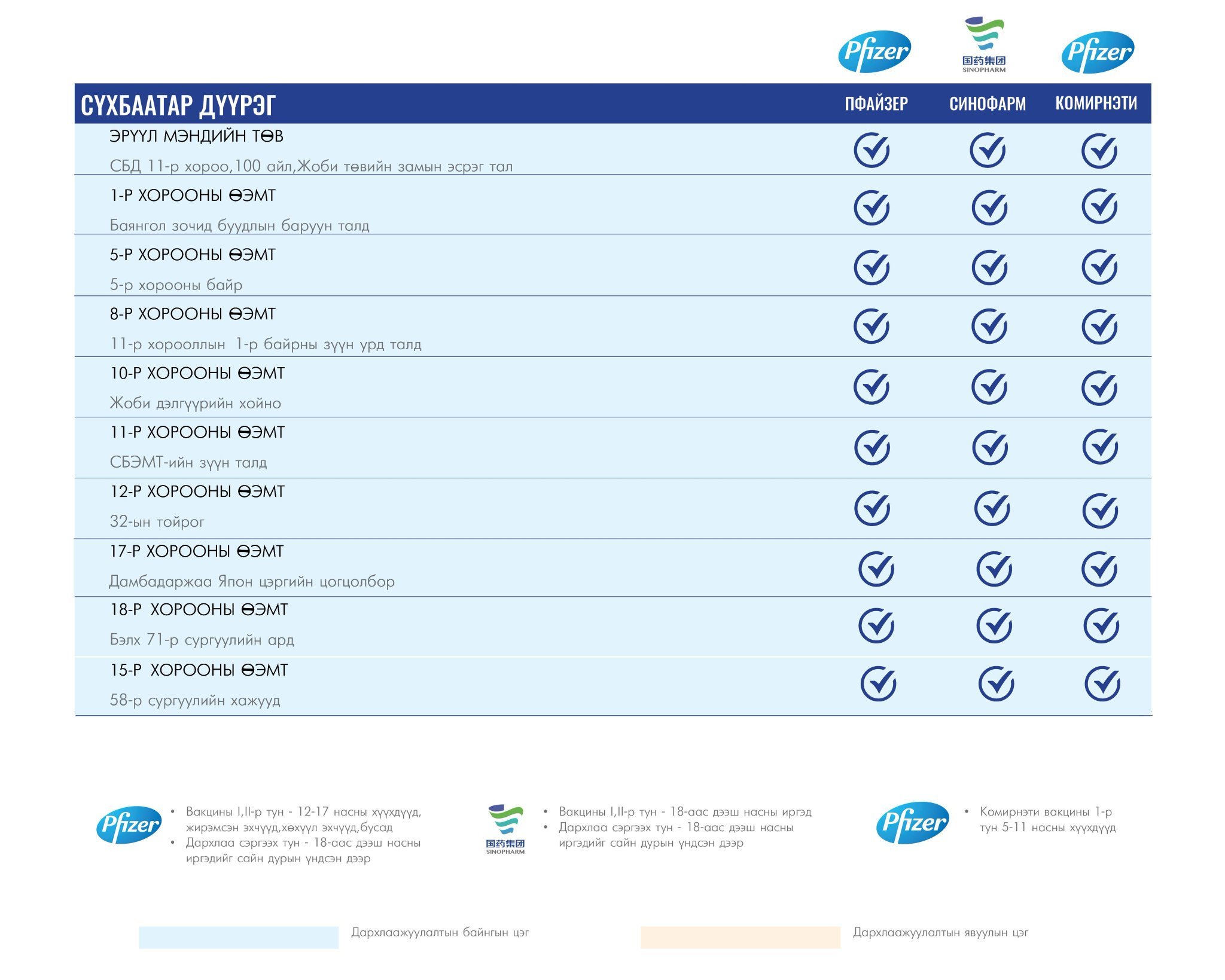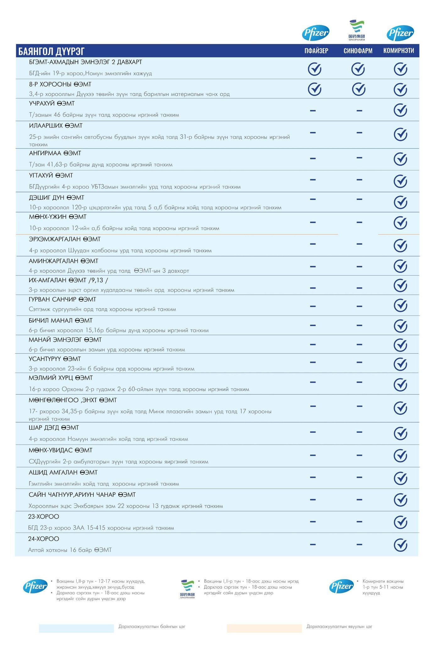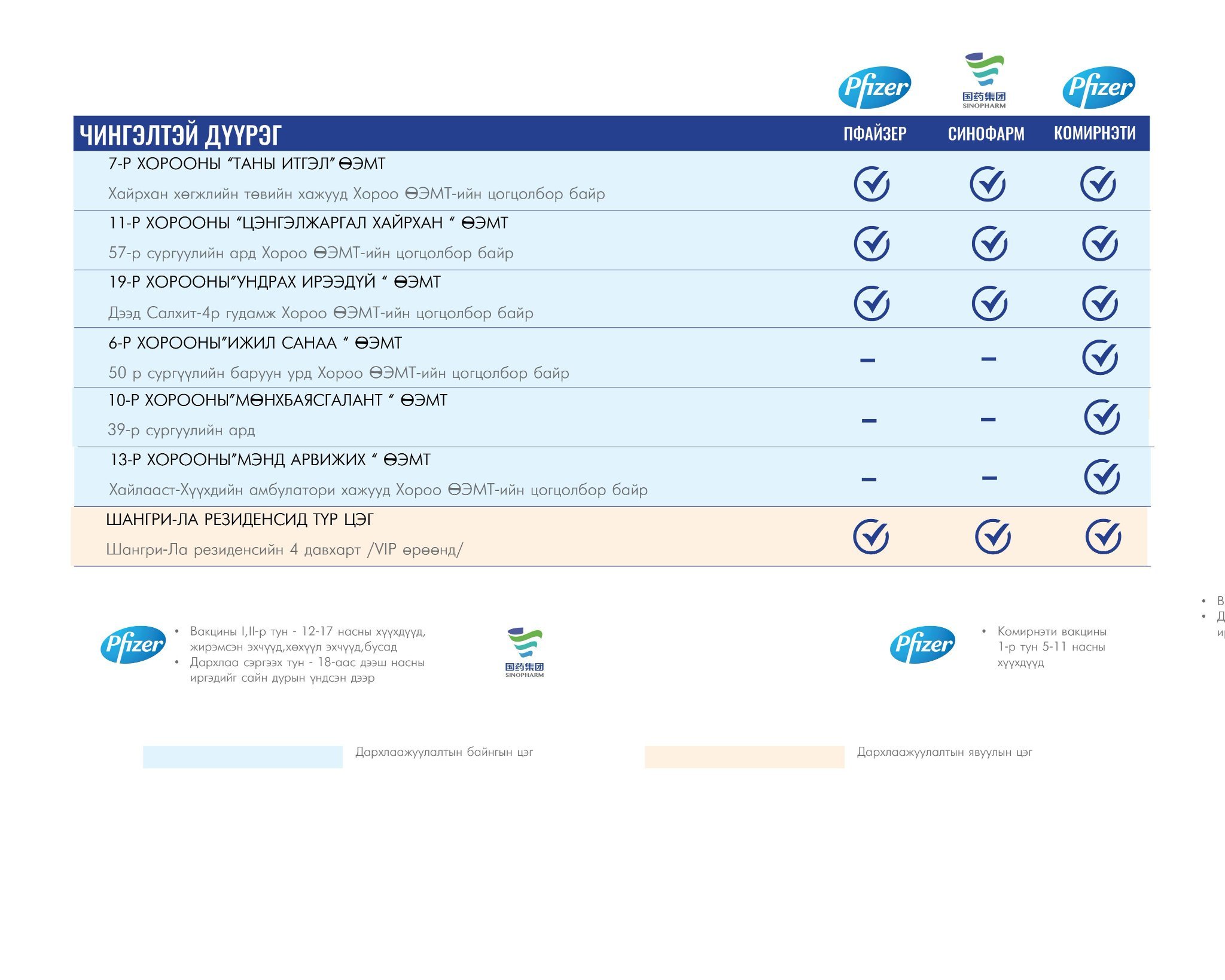 Та өөрт ойр вакцины аль ч цэгт очиж дархлаажуулалтад хамрагдах боломжтой. Дархлаажуулалтын цэгүүд 09:00-16:00 цаг хүртэл ажиллана.