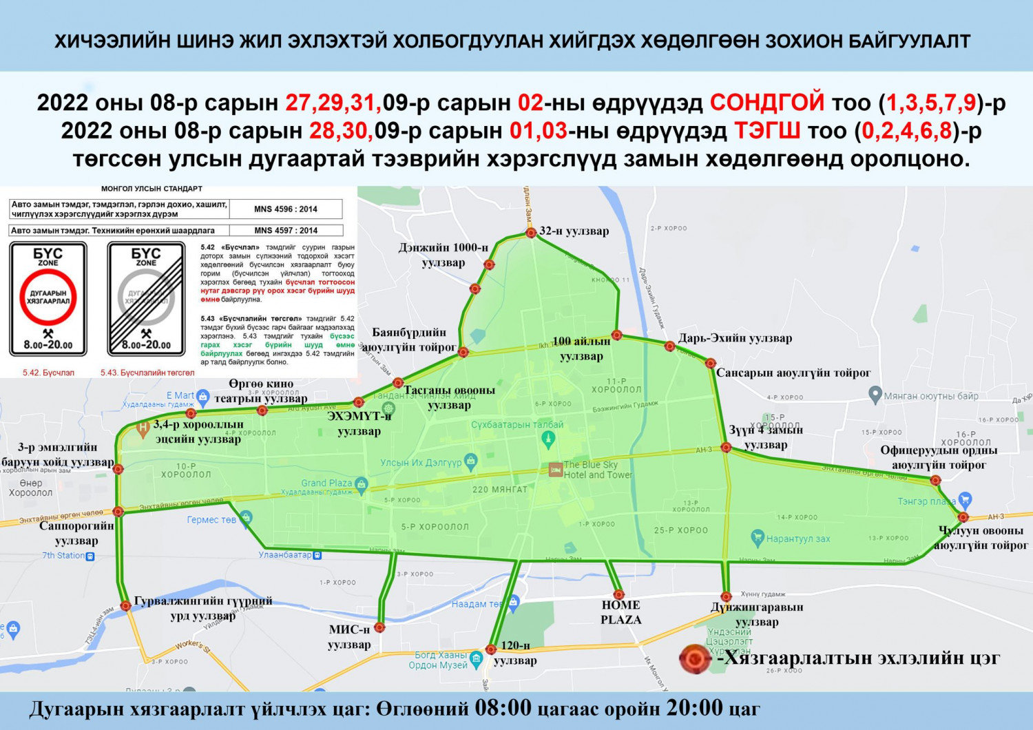 2022-2023 оны хичээлийн шинэ жил эхэлж байгаатай холбоотойгоор замын хөдөлгөөний түгжрэлийг бууруулах ажлууд хийгдэж байна. Уг ажлын хүрээнд наймдугаар сарын 27, 28-наас эхлэн автомашинуудыг улсын дугаарын тэгш, сондгойгоор хязгаарлан хөдөлгөөнд оролцуулах тухай Нийслэлийн Засаг даргын захирамж гарлаа.