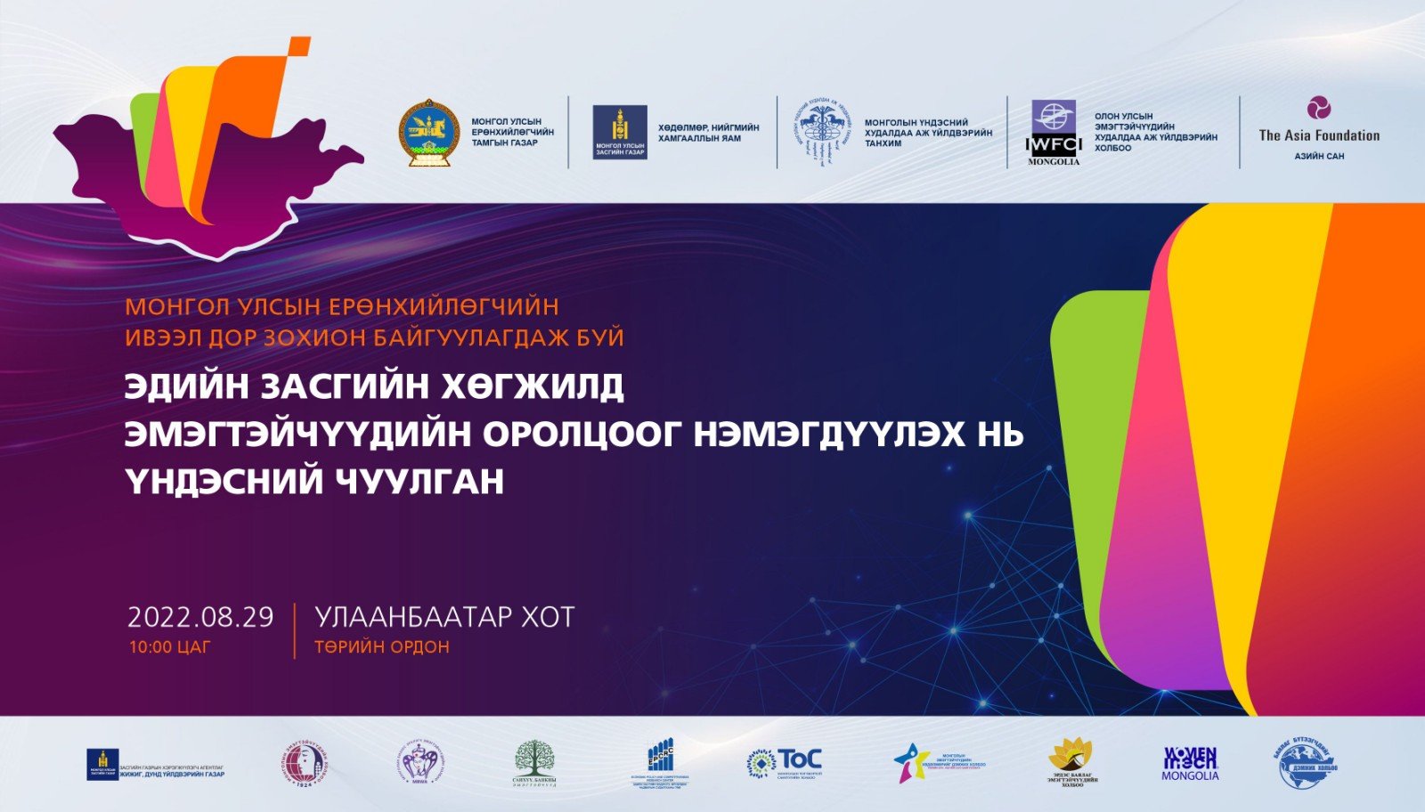 Монгол Улсын Ерөнхийлөгч Ухнаагийн Хүрэлсүхийн ивээл дор 2022 оны 08 дугаар сарын 29-ний өдөр Төрийн ордонд “Эдийн засгийн хөгжилд эмэгтэйчүүдийн оролцоог нэмэгдүүлэх нь” үндэсний чуулган зохион байгуулна.