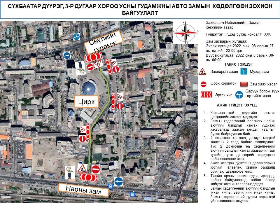 Тодруулбал Циркийн хойд уулзвараас Нарны зам хүртэлх замыг наймдугаар сарын 27-ны 23:00 цагаас наймдугаар сарын 30-ны 06:00 цагийн хооронд хааж, асфальт бетон хучилт хийх юм.