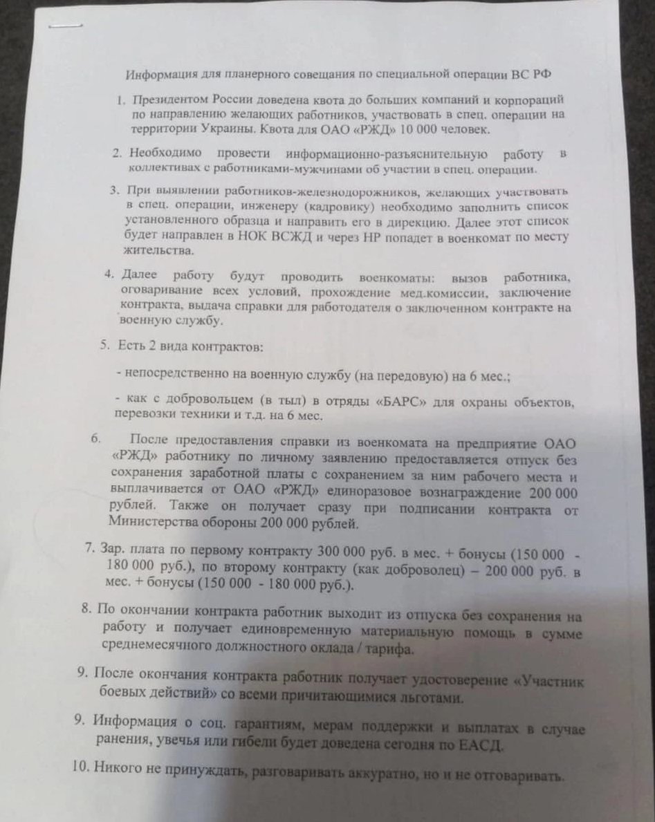 "Украины нутаг дэвсгэр дээр явагдаж буй тусгай ажиллагаанд оролцох хүсэлтэй ажилтнуудыг илгээх квотыг Оросын Ерөнхийлөгч компани, корпорациудад тавьсан. "РЖД" (shuud.mn: Оросын төмөр зам)-ийн квот 10 мянган хүн" хэмээн дотоод баримт бичигт өгүүлсэн байна.