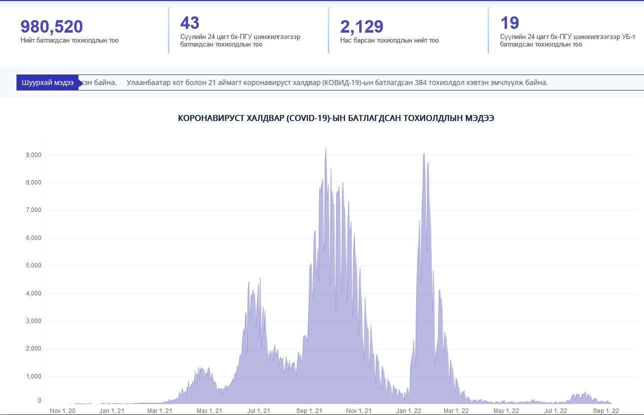 Нийт батлагдсан тохиолдлын 539 358 (55.0%) нь Улаанбаатар хотод бүртгэгдсэн байна. Өнөөдрийн байдлаар Улаанбаатар хот болон 21 аймагт халдвараар өвчидсөн 384 хүн эмнэлэгт хэвтэн эмчлүүлж байна.