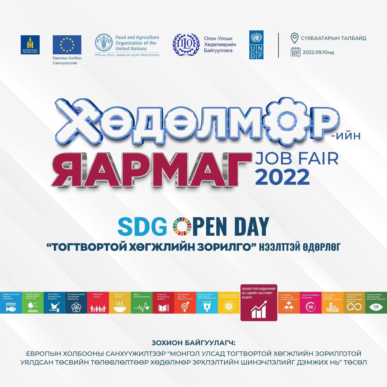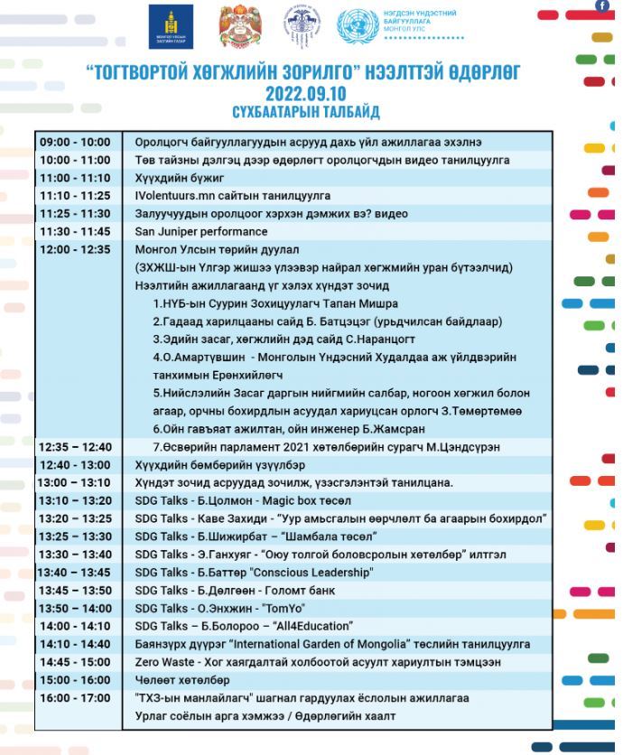 Монгол дахь Нэгдсэн Үндэстний Байгууллага, Монгол Улсын Эдийн засаг, хөгжлийн яам, Гадаад харилцааны яам, Нийслэлийн Засаг даргын Тамгын газар, Монголын Үндэсний худалдаа, аж үйлдвэрийн танхим хамтран “Тогтвортой хөгжлийн зорилго” өдөрлөгийг есдүгээр сарын 10-ны өдөр бүх нийтэд нээлттэйгээр “Сүхбаатарын талбай”-д зохион байгуулах гэж байна.