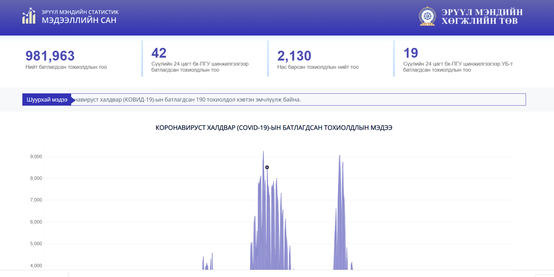 Ингэснээр улсын хэмжээнд батлагдсан тохиолдол 981 963 болон нэмэгдлээ. Өнөөдрийн байдлаар Улаанбаатар хот болон 21 аймагт коронавируст халдвар (КОВИД-19)-ын батлагдсан 190 тохиолдол хэвтэн эмчлүүлж байна.