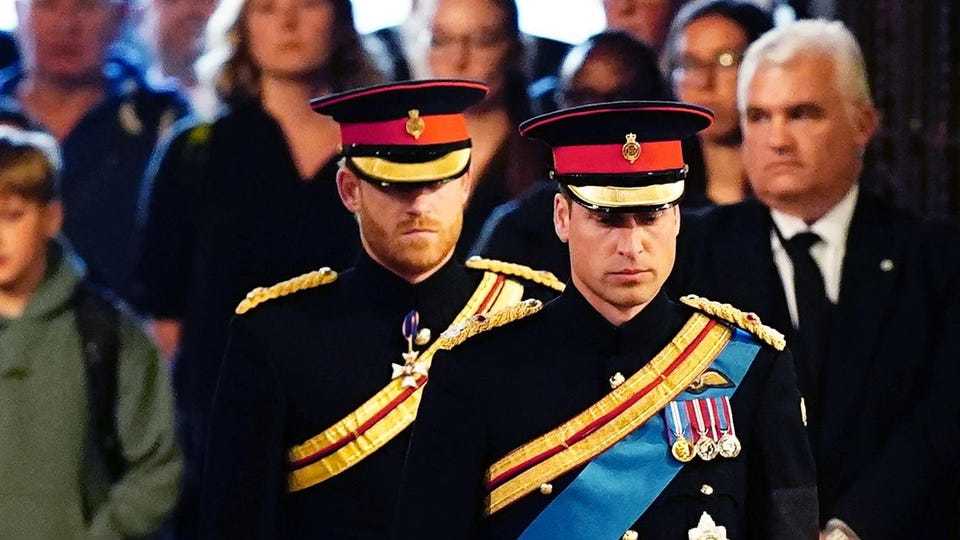 Ням гарагт шилжих шөнө хатан хаан II Элизабетийн найман ач, зээ 15 минутийн хугацаанд эмээгийнхээ авсны өмнө хүндэт харуул болж зогсжээ. The Times сонины мэдээлснээр, хааны хүсэлтээр ханхүү Харри цэргийн дүрэмт хувцас өмссөн байна. Тэрбээр хааны гэр бүлийн давуу эрхээс татгалзсаныхаа дараа цэргийн хэргэмээсээ салсан бөгөөд өмнөх гашуудлын ажиллагаанд энгийн хувцастай оролцож байсан юм.