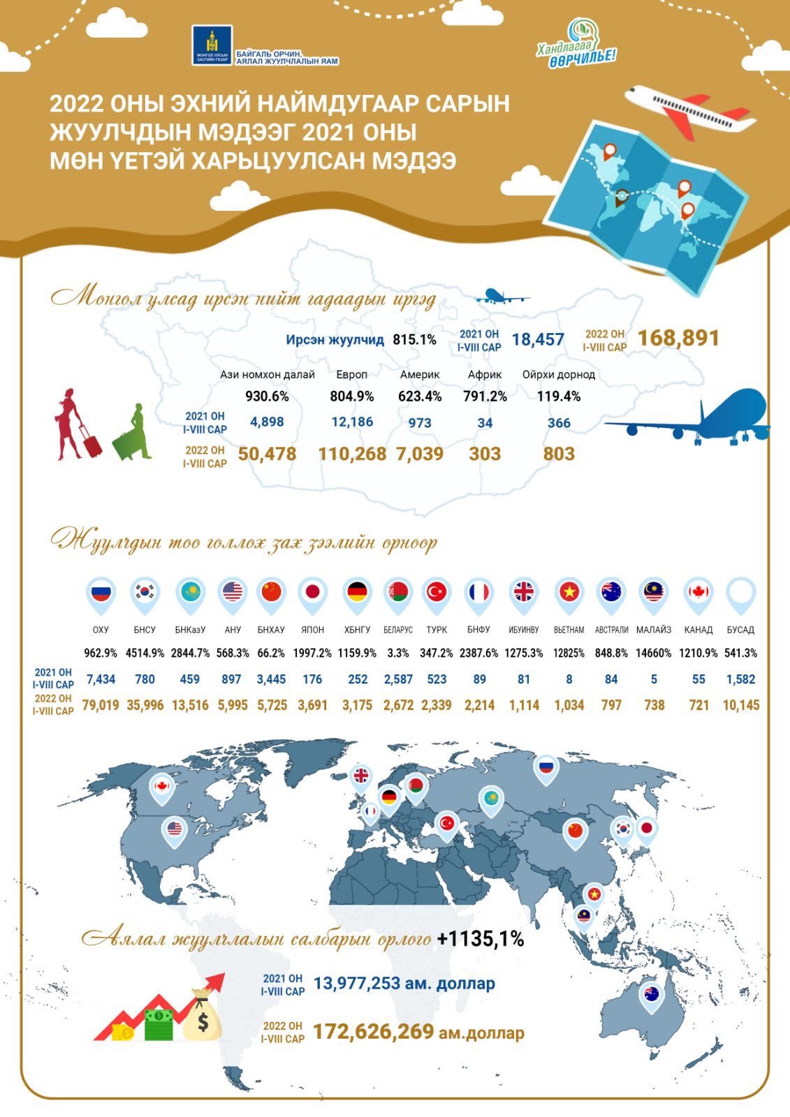 Энэ оны нэгдүгээр сарын нэгнээс наймдугаар сарын 31 хүртэлх хугацаанд Монгол Улсад 168 891 жуулчин иржээ. Тэдгээрийг улс орноор нь ангилбал: