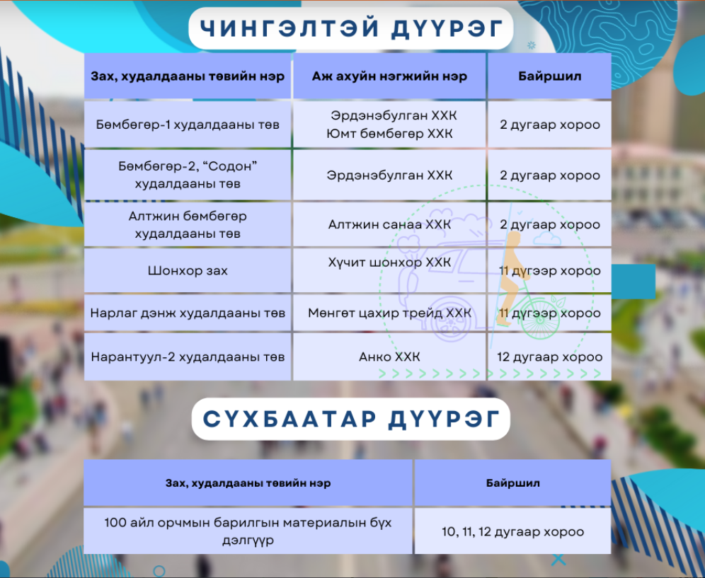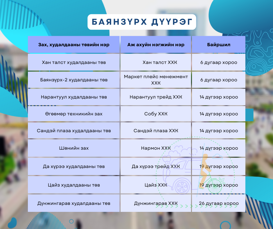 Тус арга хэмжээний үеэр амрах томоохон зах, худалдааны төвүүдийн талаарх мэдээллийг хүргэе.