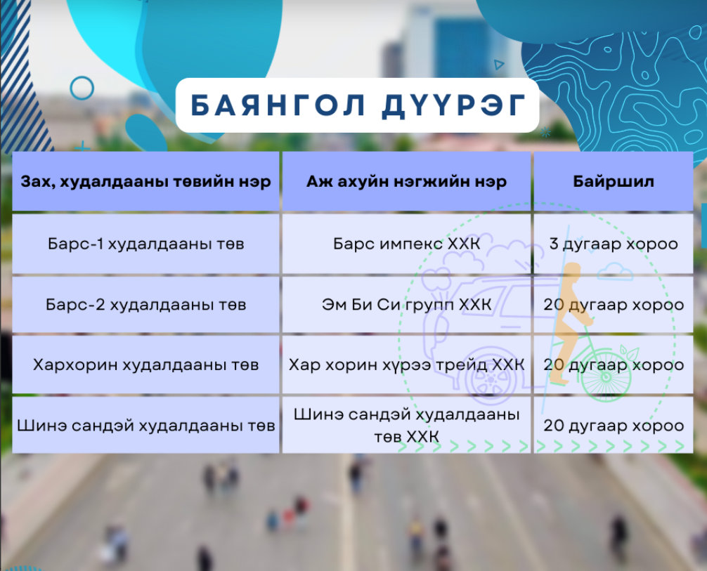 "Автомашингүй өдөр-2022" -ийн үеэр Чингэлтэй, Баянзүрх, Сүхбаатар, Баянгол дүүрэгт орших 19 томоохон зах, худалдааны төв болон 100 айл орчмын барилгын материалын бүх дэлгүүр амрах юм.