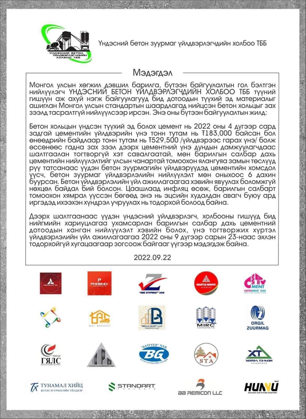 Цементийн үнийн өсөлт, хомстолоос үүдэн Бетон зуурмагийн үйлдвэүүд үйл ажиллагаагаа зогсоож байгаагаа мэдэгдлээ. Үндэсний бетон зуурмаг үйлдвэрлэгчдийн холбоо ТББ-ын гишүүн 19 компани өнөөдрөөс эхлэн цементийн ханган нийлүүлэлт хэвийн болох хүртэл үйл ажиллагаагаа тодорхойгүй хугацаагаар зогсоож байна.