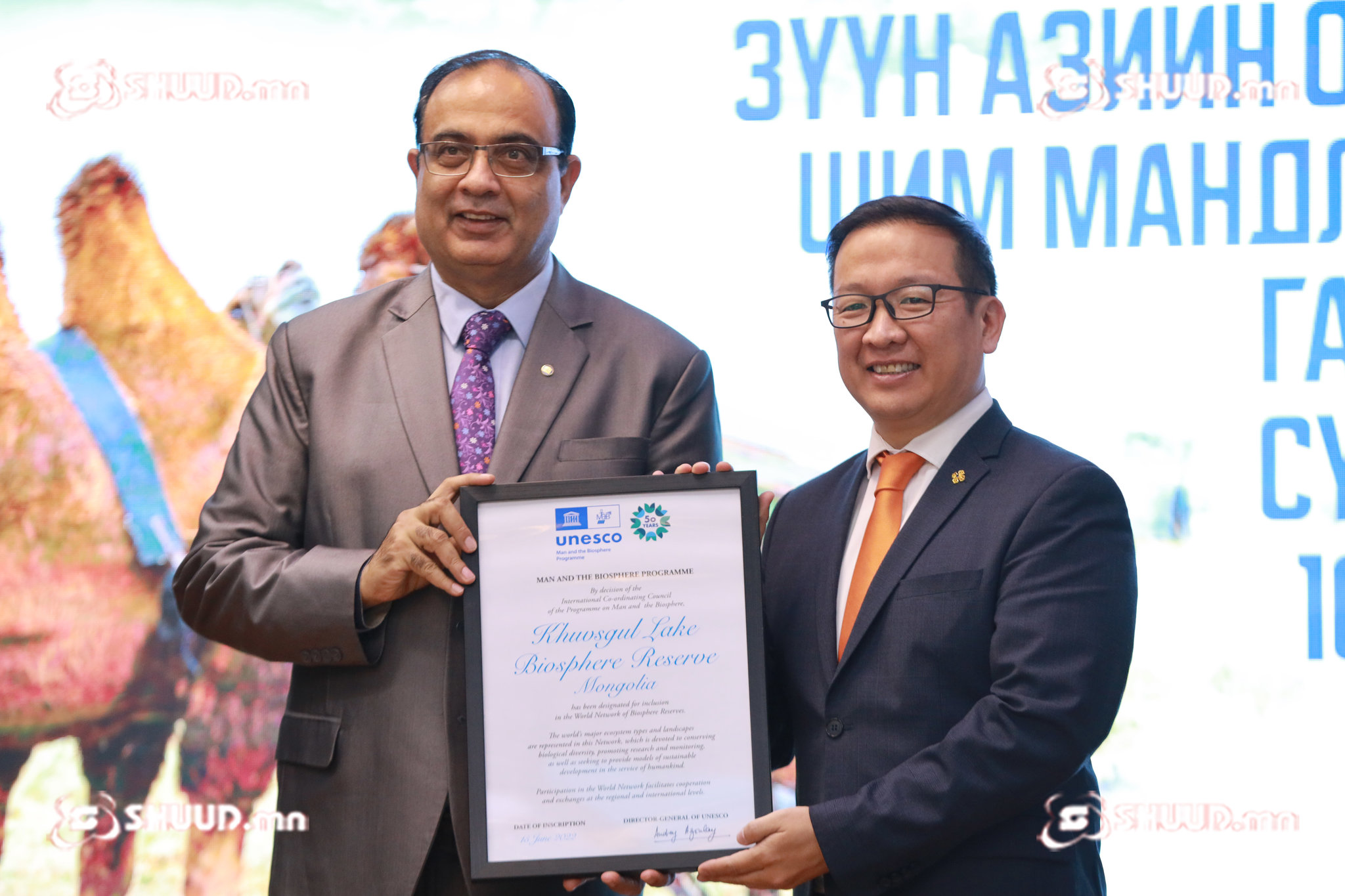Энэ үеэр ЮНЕСКО-ийн Бээжин дэх төлөөлөгчийн газрын захирал Шахбаз Хан Хөвсгөл нуурын Шим мандлын нөөц газрын болон Увс нуурын хотгорын хил дамнасан нөөц газрын батламжийг БОАЖЯ, Ерөнхийлөгчийн Тамгын газар, БОАЖЯ-ны Тусгай хамгаалалттай бүс нутгийн газар, Хөвсгөл нуурын Шим мандлын нөөц газар, Увс нуурын Шим мандлын нөөц газарт өглөө.