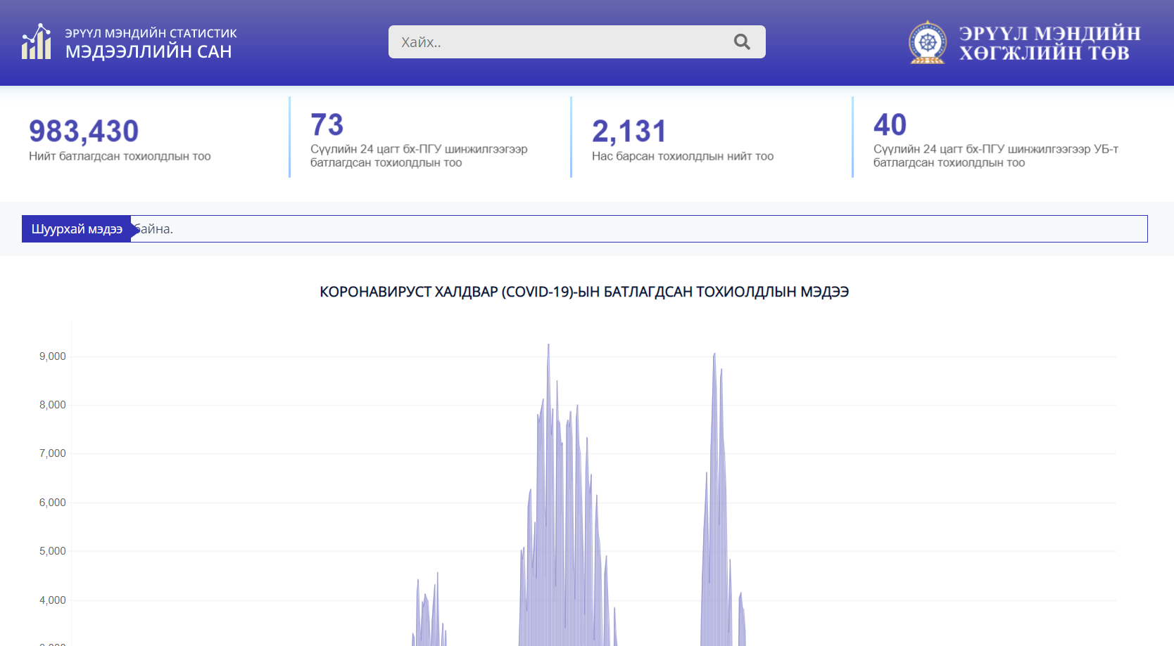 Сүүлийн 24 цагийн хугацаанд улсын хэмжээнд коронавирусийн халдварын 73 тохиолдол батлагджээ. Үүний 40 нь Улаанбаатарт, 33 нь орон нутагт бүртгэгдсэн байна. Ингэснээр улсын хэмжээнд нийт батлагдсан тохиолдол 983 430 боллоо.
