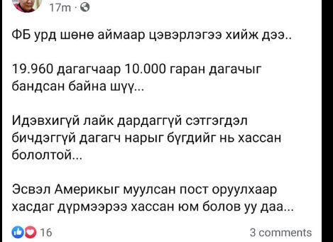 Фэйсбүүкд олон дагагчтай байгууллага, хувь хүмүүсийн дагагчийн тоо огцом буурсан тухай мэдээлэл нийгмийн сүлжээнд тархаад байна . Тодруулбал, 10 мянгаас дээш дагагчтай иргэдэд ямар нэг мэдэгдэл тайлбар ирээгүй байна. Зарим эх сурвалжуудын мэдээллээр дагагчийн тоог нуудаг тохиргоо хийсэн гэдгийг мэдээлж байна.