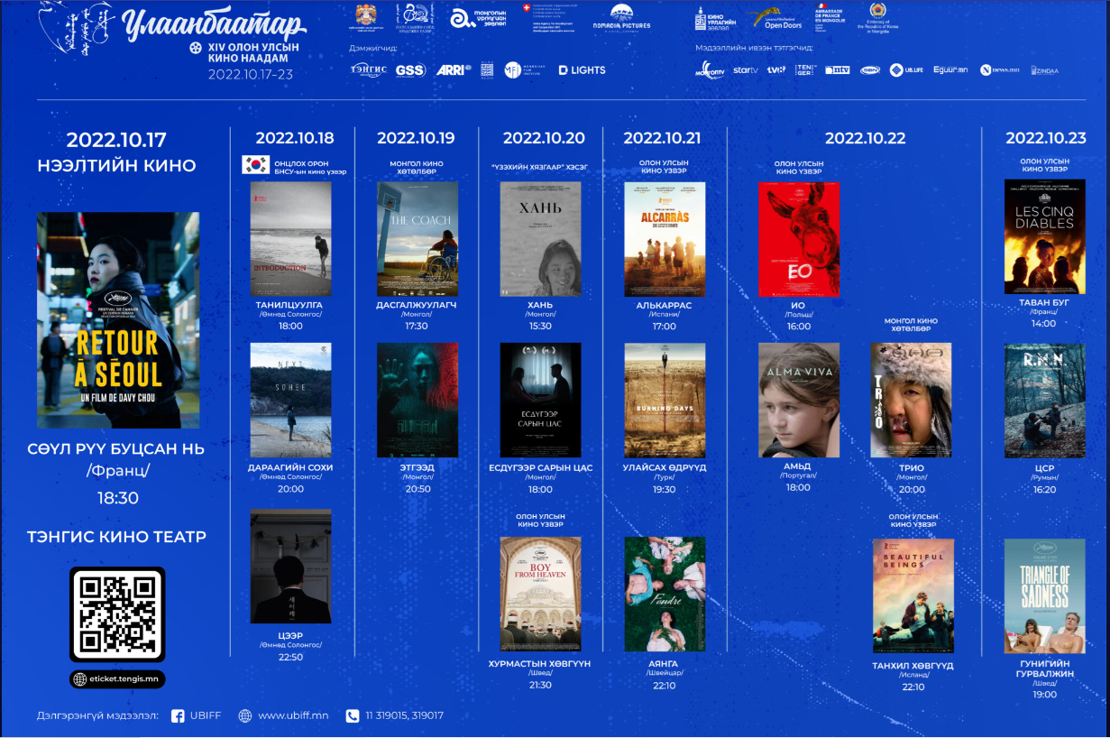 Энэ жилийн наадмын онцлох орноор БНСУ сонгогдсон бөгөөд Канн, Берлин, Венец, Торонто зэрэг дэлхийн А зэрэглэлийн кино наадмын шагналт, 2021-2022 онд бүтээсэн Монгол, БНСУ, Франц, Португал, Бельги, Турк, Швед, Испани, Исланд, Польш, Румын, Швейцар, Герман, Их Британи, Дани, Нидерланд, Чех зэрэг улсын 18 бүрэн хэмжээний уран сайхны кино, богино хэмжээний нэг киног үзэгчдэд толилуулах юм.