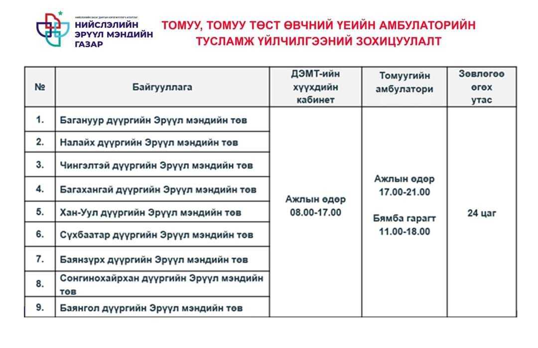 Харин амралтын өдрүүдээр 18:00 цаг хүртэл ажиллаж, томуугийн тусламж, үйлчилгээг үзүүлэхээр болж байгаа юм.