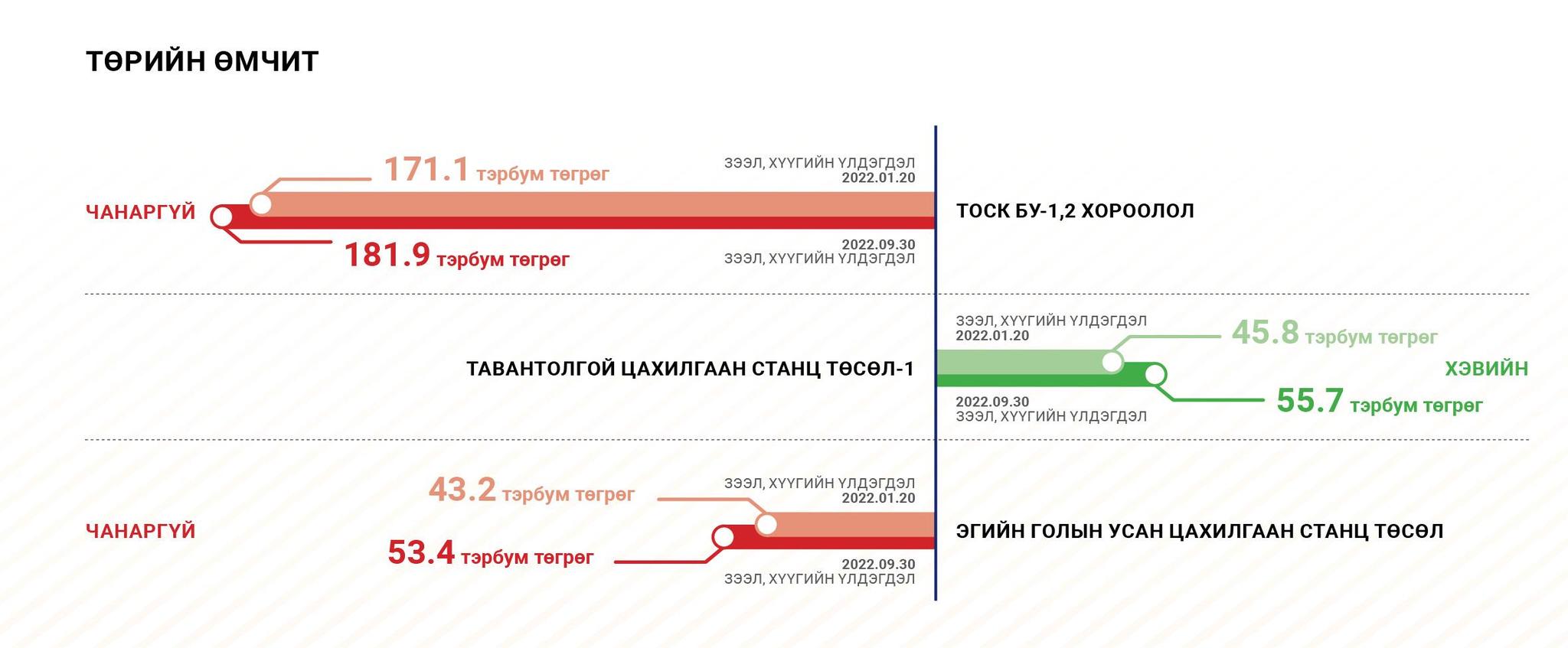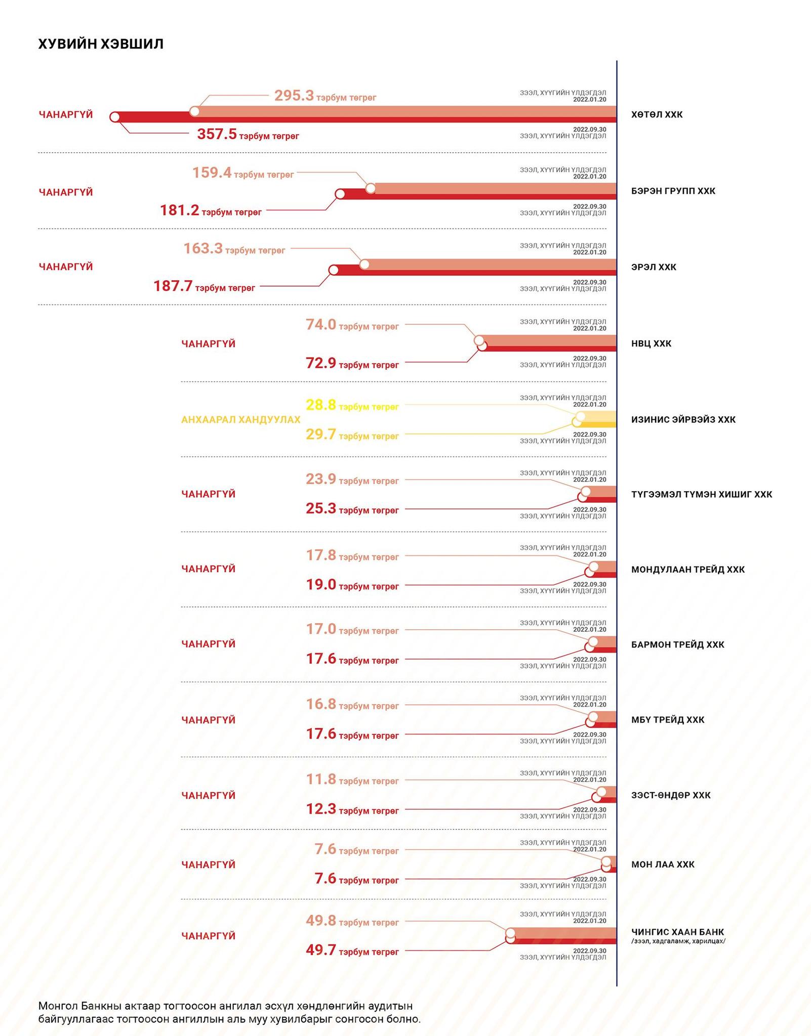 Хөгжлийн банкны нийт зээл, хүүгийн өрийн үлдэгдэл 2022 оны 9 дүгээр сарын 30-ны өдрийн байдлаар 2.7 их наяд төгрөгтэй тэнцэж байна. Нийт 53 зээлдэгчийн 2.7 их наяд төгрөгтэй тэнцэх хэмжээний зээл, хүүгийн өрийн үлдэгдэл байна. Үүнээс 31 хувь нь төрийн өмчит компанийн 8 зээлдэгчийн 874.5 тэрбум төгрөгийн багц, 69 хувь нь хувийн хэвшлийн 45 зээлдэгчийн 1.9 их наяд төгрөгийн багц байна.