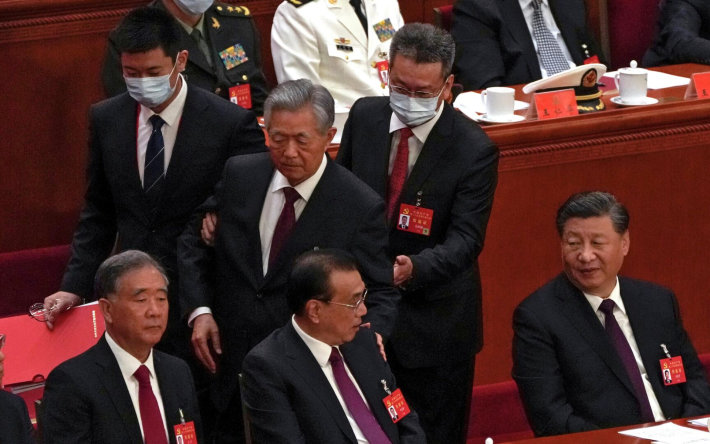 Хурлын үеэр Ши Жинпинийн хажууд сууж байсан Ху Жинтао руу гэнэт хүмүүс дөхөн очиж, гараас нь барин, суудлаас босгон хүчээр шахам авч гарч байгаа нь танхимд байгаа олныг гайхшрууллаа. Энэ үеэр Ху ихэд гайхшран, Ши Жинпин рүү харан ямар нэг зүйл хэлэхэд Ши хариуд нь толгой дохиж байгаа бичлэг тархжээ.