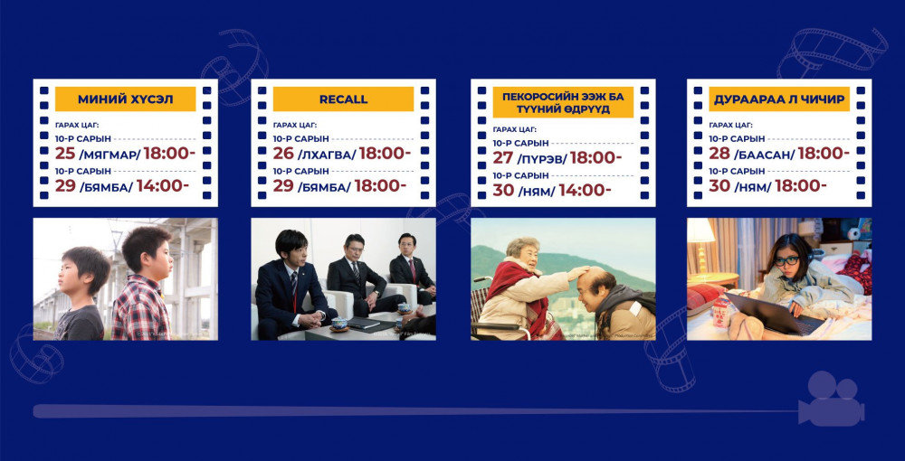Японы Элчин сайдын яам “Япон Сан”-тай хамтран Тэнгис кино театрт “Японы кино өдрүүд 2022” -ийг зохион байгуулахаар болжээ. Тус кино өдрүүдээр кино тус бүрийг хоёр удаа үзэгчдэд толилуулах юм байна. Кино өдрүүд энэ сарын 25-наас 31-нийг хүртэл үргэлжлэх юм.