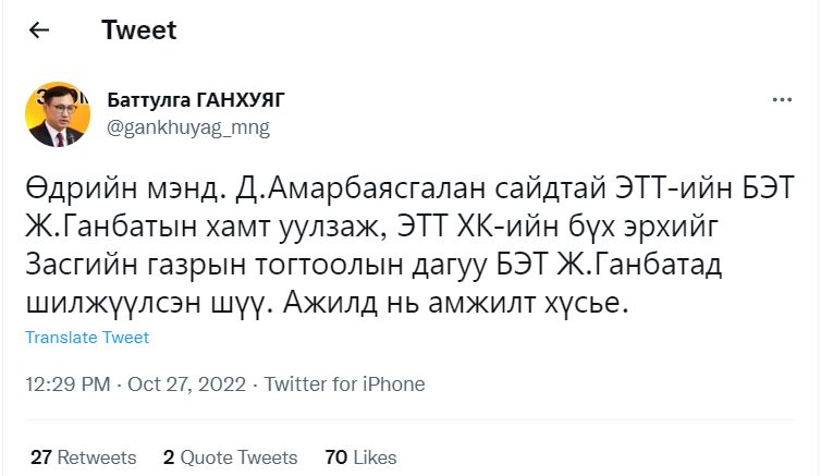 Б.Ганхуяг энэхүү мэдээллийн араас удалгүй өөрийн твиттер хуудсандаа “Өдрийн мэнд. Д.Амарбаясгалан сайдтай ЭТТ-ийн БЭТ Ж.Ганбатын хамт уулзаж, ЭТТ ХК-ийн бүх эрхийг Засгийн газрын тогтоолын дагуу БЭТ Ж.Ганбатад шилжүүлсэн шүү. Ажилд нь амжилт хүсье” хэмээн бичжээ.
