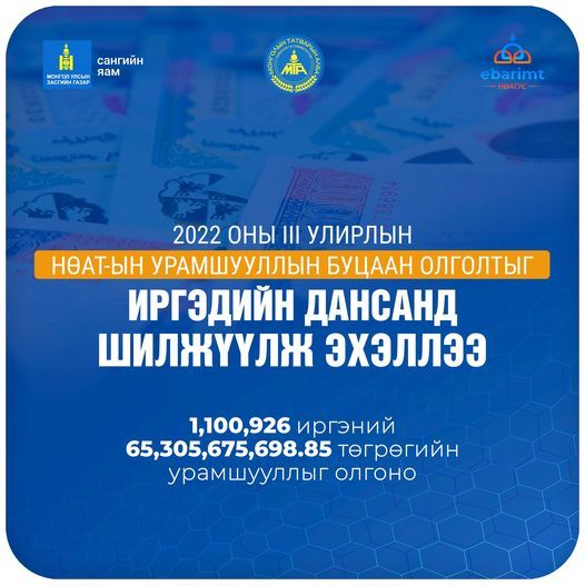 Гуравдугаар улирлын НӨАТ-ын урамшууллын буцаан олголтыг өнөөдрөөс иргэдийн дансанд рүү шилжүүлж эхэллээ. 2022 оны гуравдугаар улиралд нийт 1,100,926 иргэний 65 тэрбум 305 мянган төгрөгийн урамшууллыг олгох юм.